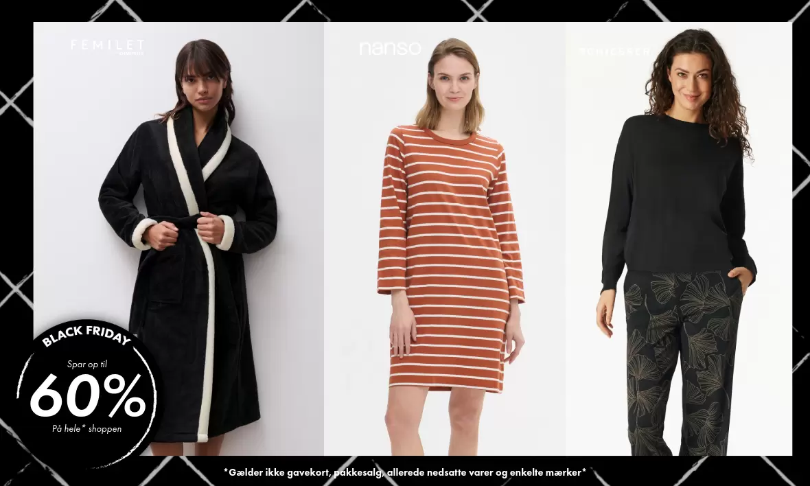 Du finder vores nattøj i forskellige styles, materialer og farver. Er du til det klassiske look med en feminin natkjole og trusser, eller elsker du bare at sove i en farverig pyjamas? Hos os finder du det hele, og skulle du alligevel ikke finde lige præcis det undertøj, du søgte online, så kom forbi os. Vi vil gerne hjælpe dig med at finde lige det, du drømmer om.Vi har stor fokus på at finde det undertøj, der matcher dig og din personlighed