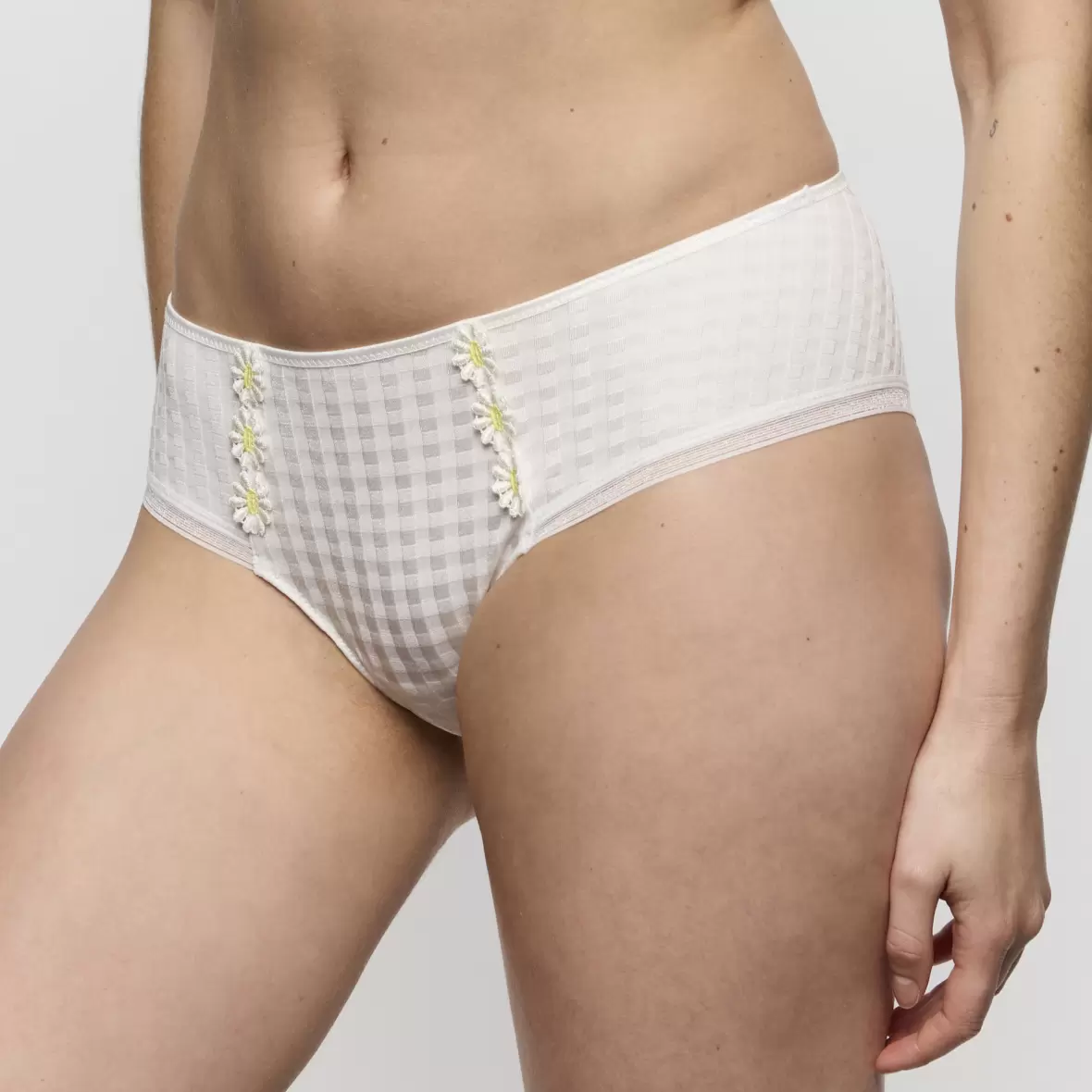 Oplev den perfekte kombination af komfort og stil med Avero Hipster i farven Ivory Petal fra Marie Jo. Denne hipster trusse er designet til at give dig et elegant look. Den er lavet af et lyst, ternet stof, der tilføjer et friskt og feminint udtryk til din undertøjsskuffe. Trussen har en lav benskæring, hvilket giver en behagelig følelse, mens den brede livvidde sikrer god støtte hele dagen.Den smukke detalje med to rækker af blomster foran på trussen tilføjer et unikt touch, der gør den til et must-have. Kanten i livet er udstyret med en elastikkant, der giver en optimal pasform uden at stramme.