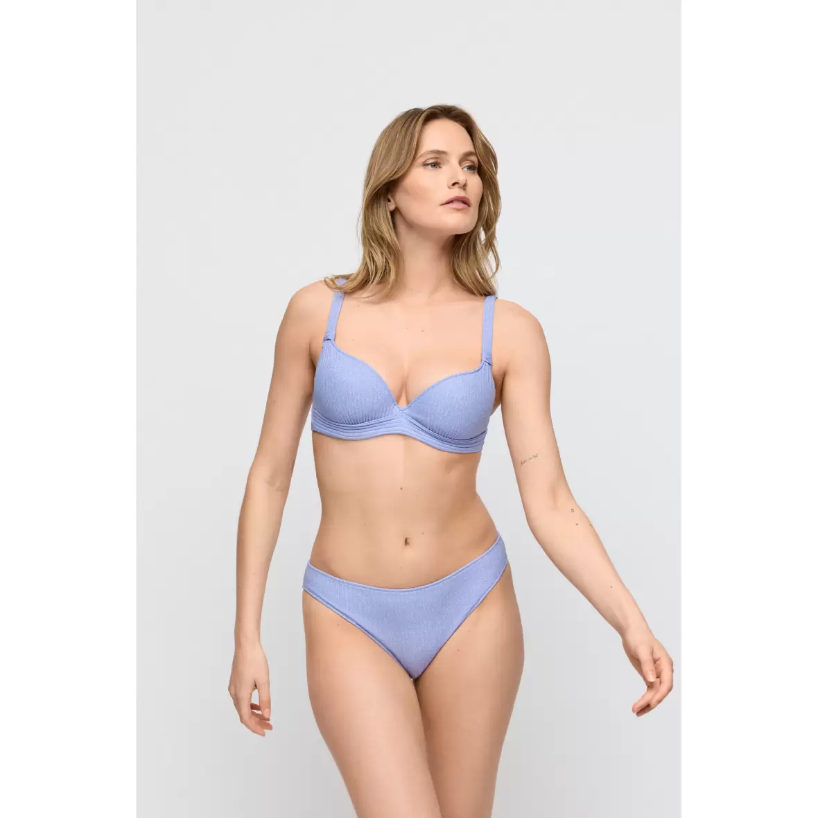 Denne blå og elegante bikinitusse fra Marie Jo er den perfekte tilføjelse til din sommergarderobe. Tinjis Bikini Tai i farven Sparkling Dusk er designet med en small livvidde, der giver dig en flatterende pasform og komfort. Trussen er fremstillet i et luksuriøst "glimmer" materiale, som tilføjer et hint af glamour til dit strandlook.Det er vigtigt at huske, at badetøj skal sidde til, da det udvider sig, når det bliver vådt, så vælg din størrelse med omhu.