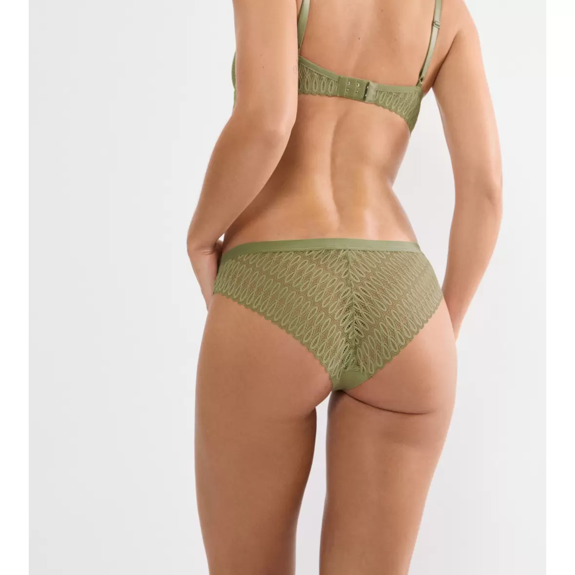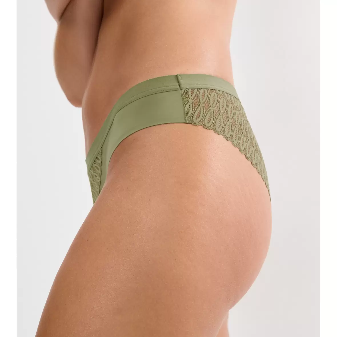 Denne grønne trusse er en brasiliansk tai model, der kombinerer elegance og komfort på bedste vis. Med sin smukke farve i Olive Gold tilføjer den et strejf af luksus til din lingeri-kollektion. Trussen er lav og smal i livet, hvilket giver en flatterende pasform, mens den bagpå er smallere end en almindelig tai trusse, hvilket skaber en forførende silhuet.Den delikate blonde på bagsiden tilføjer et romantisk touch, mens elastikkanten i livet sikrer, at trussen sidder perfekt hele dagen. Uanset om du skal til en særlig anledning eller bare ønsker at forkæle dig selv, er denne brasilianske trusse et oplagt valg.