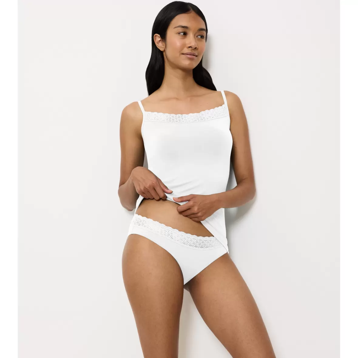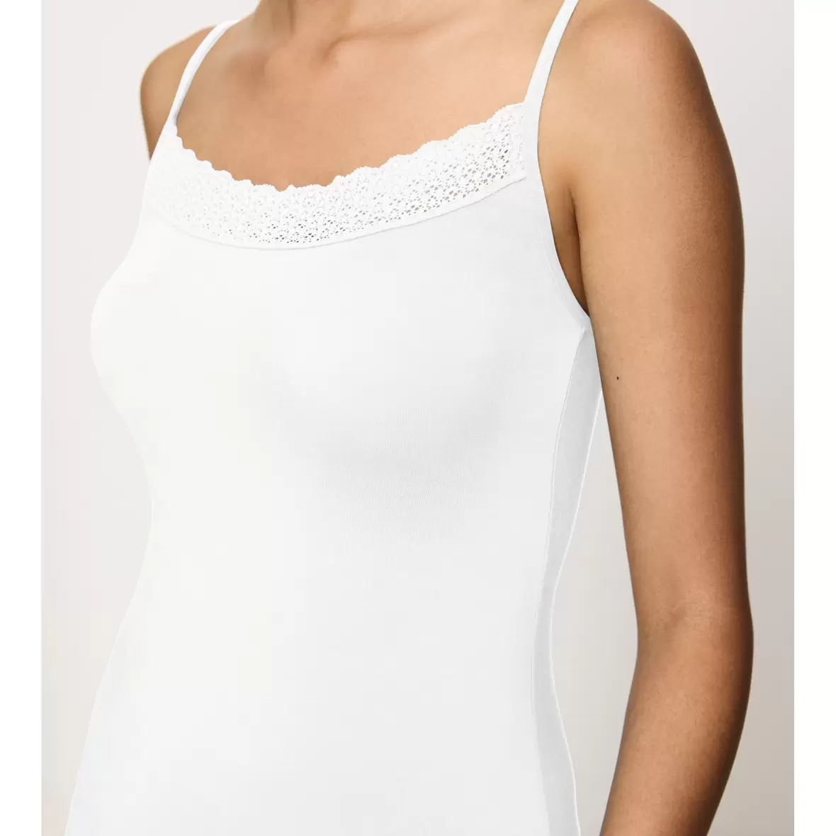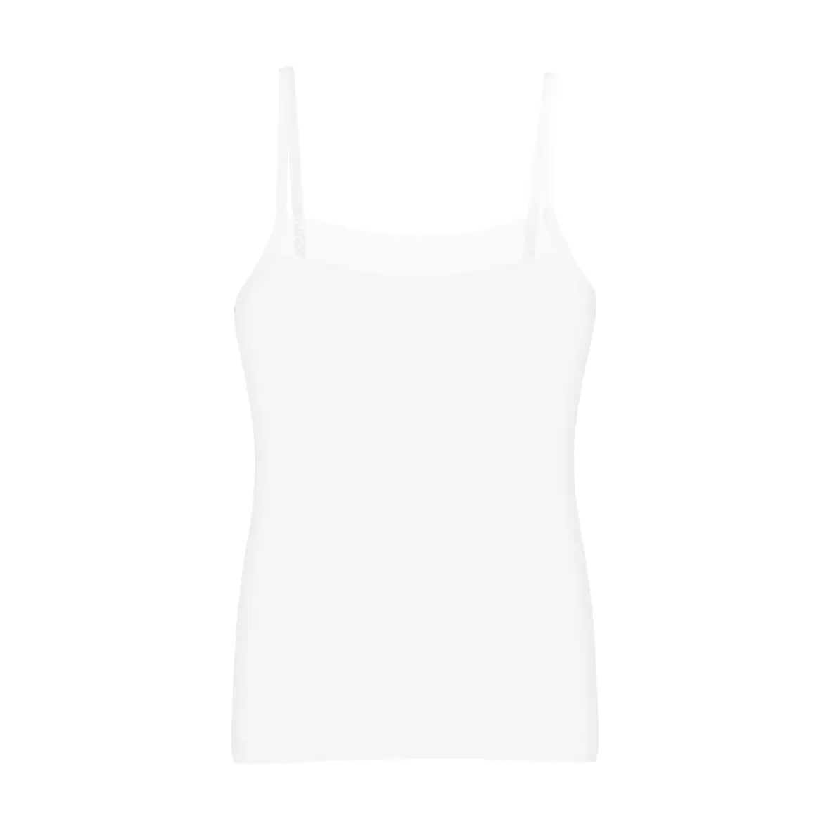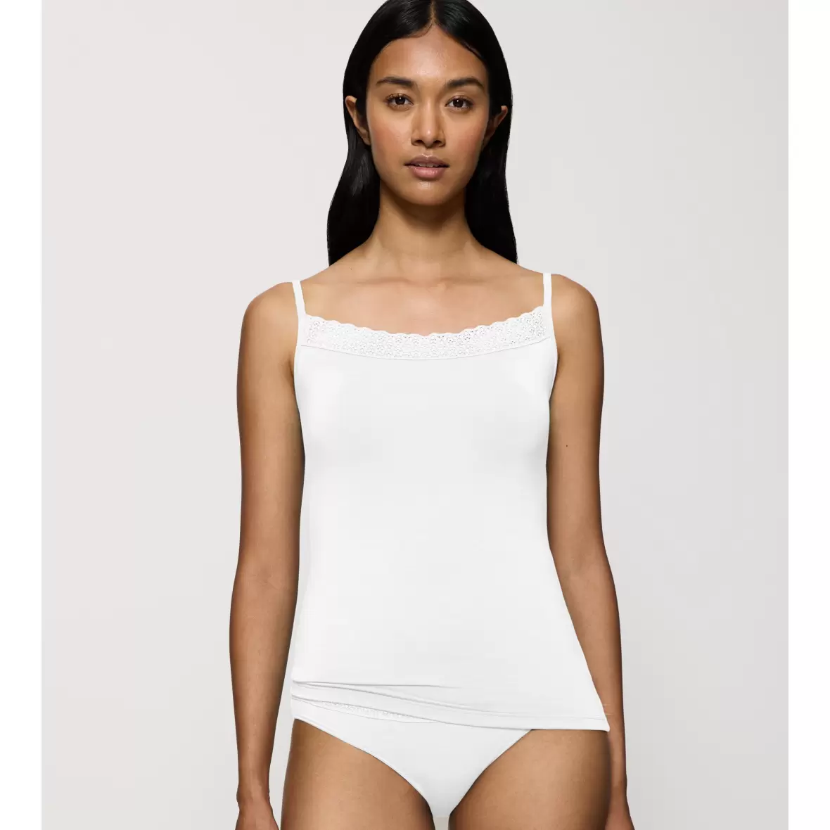 Denne elegante hvide undertrøje fra Triumph er den perfekte tilføjelse til dit undertøjssortiment. Med fine blonder og smalle, justerbare stropper sidder den komfortabelt. Uanset om du bruger den som en del af dit daglige outfit eller til en speciel lejlighed, vil denne top helt sikkert fremhæve din stil. Den bløde TENCEL Modal-blanding giver en fantastisk følelse mod huden, hvilket gør den ideel til hele dagen brug. Glem ikke at finde de tilsvarende trusser fra kollektionen for at komplettere dit look.Materiale: