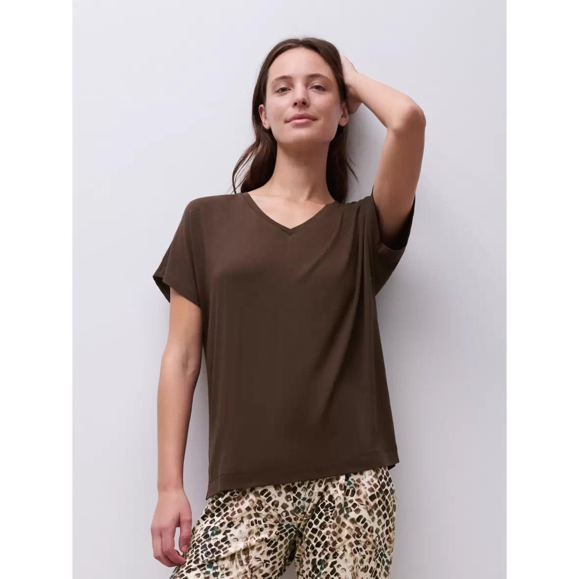 Opdag den stilfulde Loraine bluse med kort ærme, i farven Ebony fra Femilet, perfekt til afslappede aftener derhjemme eller som en del af dit nattøj. Denne bluse har en smuk v-halsudskæring, der tilføjer et feminint touch, samt korte ærmer, der giver en let og behagelig fornemmelse.Lavet af en blød og komfortabel viskosekvalitet, er denne natbluse ideel til at sikre en god nattesøvn. Den ensfarvede brune nuance giver blusen et tidløst og klassisk udseende, der kan matches med dine yndlings natbukser eller shorts.