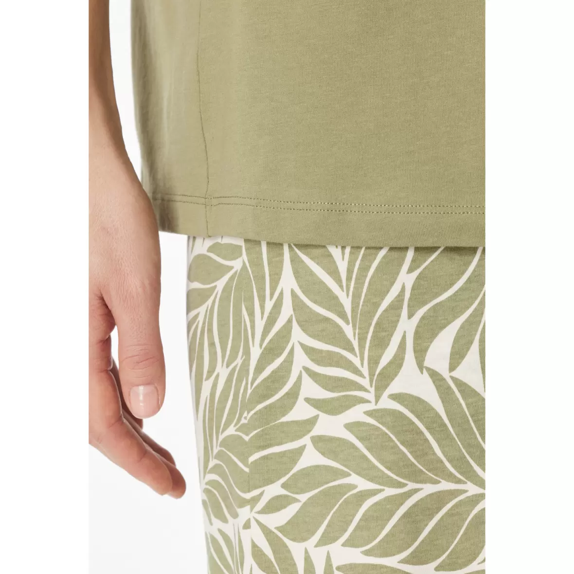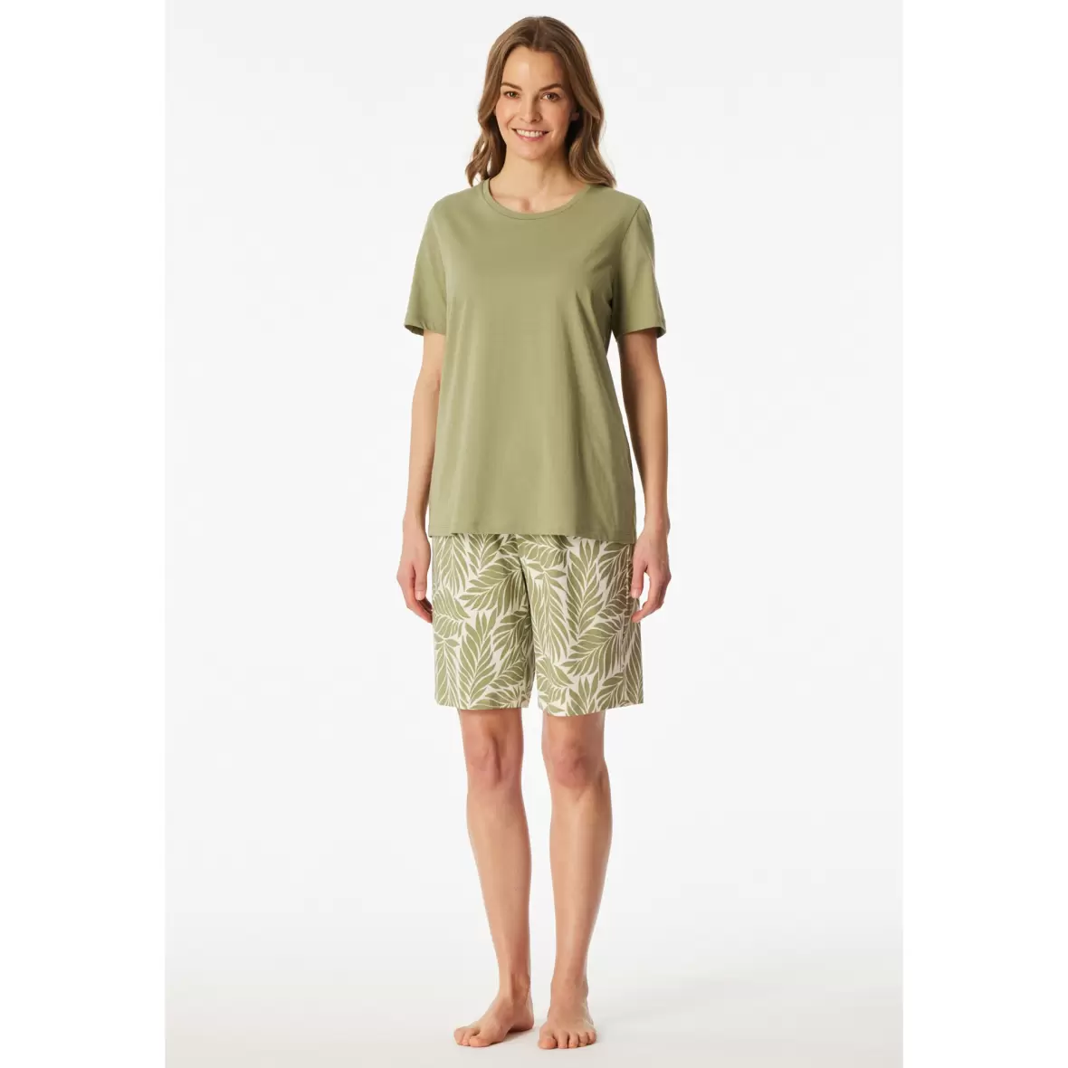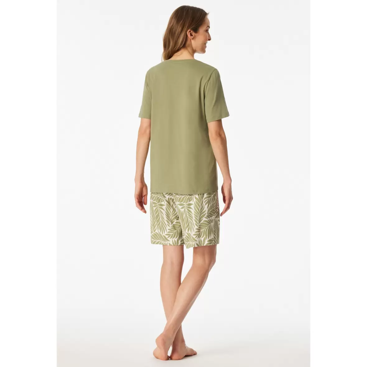 Denne korte pyjamas i farven linden green er fra mærket Schiesser. Med sin smukke grønne nuance tilføjer pyjamassen et frisk og moderne look til dit nattøj. Natblusen har korte ærmer og en rund halsudskæring, der sikrer komfort og bevægelsesfrihed, mens natbuksen er en halvlang shorts model. Det stilfulde grønne palmeprint på shortsene tilføjer et legende touch til dit soveoutfit.Fremstillet af 100% bomuld, tilbyder denne pyjamas en blød og åndbar fornemmelse, som sikrer optimal komfort hele natten.