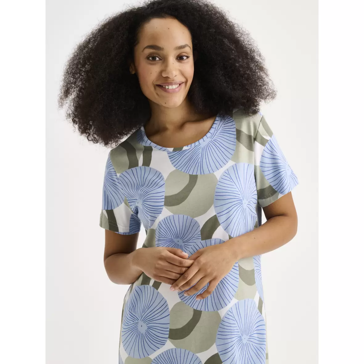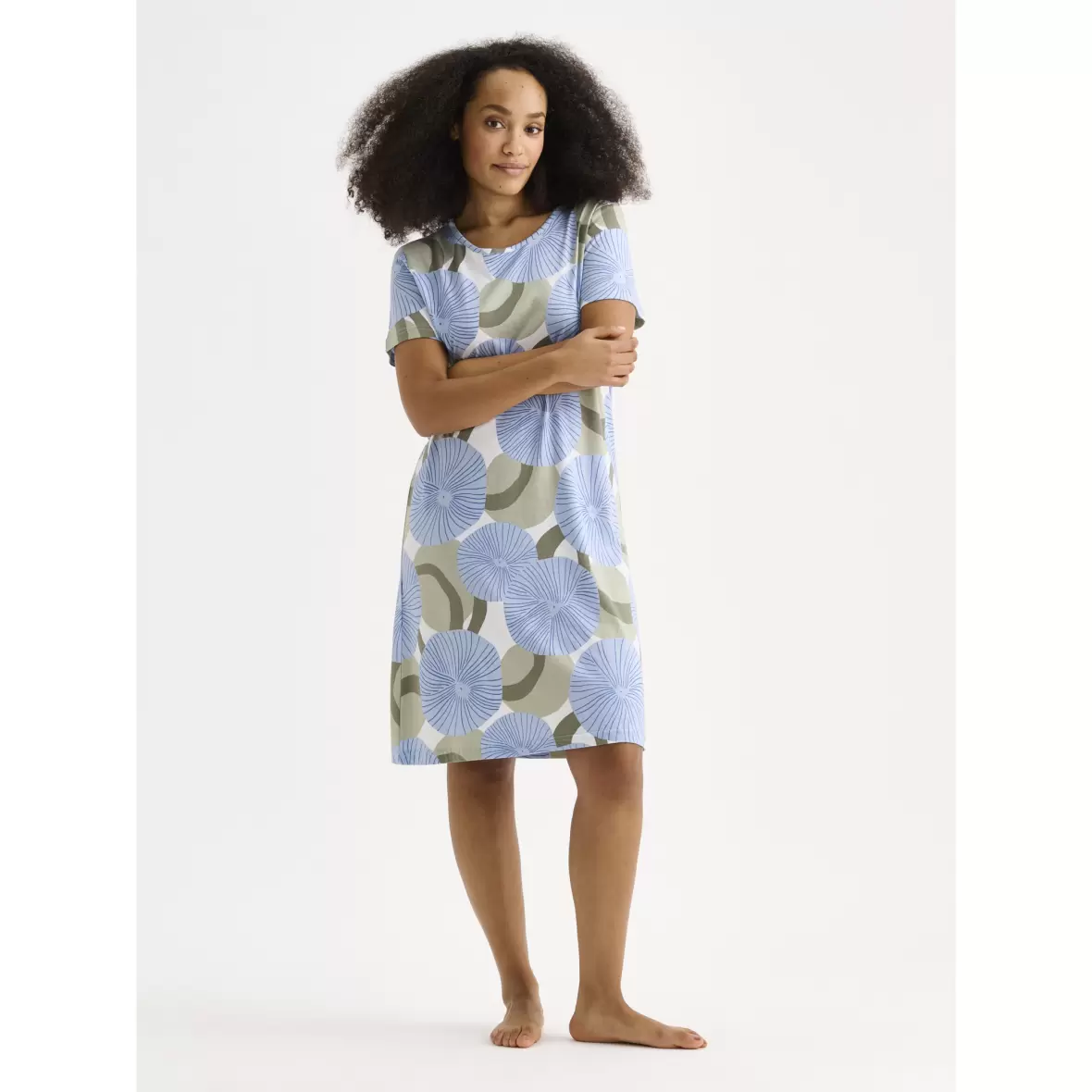 Opdag Hedda natkjolen i farve Blue Spring fra det anerkendte mærke Nanso, en perfekt tilføjelse til dit nattøj. Denne smarte natkjole har korte ærmer og en rund halsudskæring, hvilket gør den både stilfuld og komfortabel. Med en længde på ca. 95 cm i størrelse M, giver den en dejlig pasform. Natkjolen er lavet af en høj kvalitet blanding af bomuld og modal, hvilket gør den utroligt blød og behagelig mod huden. Uanset om du slapper af derhjemme eller sover, vil du nyde den lette og luftige følelse, som denne kjole tilbyder. Den kommer i den smukke farve Blue Spring, der bringer et friskt pust ind i din natgarderobe.Materiale: