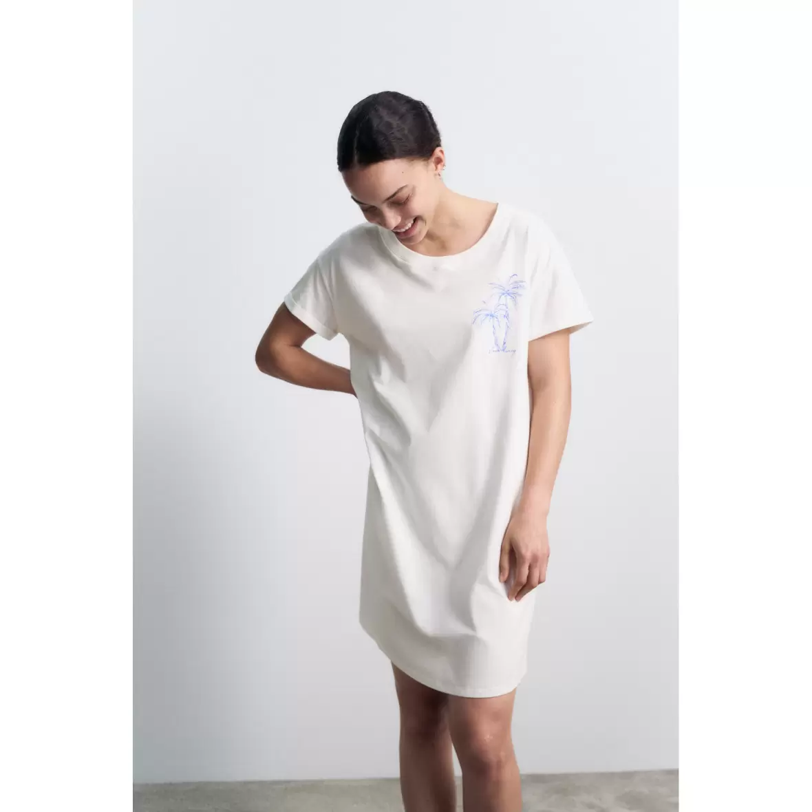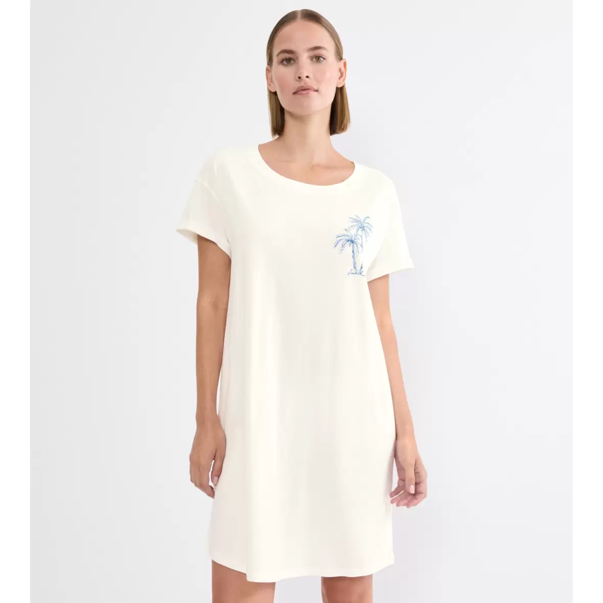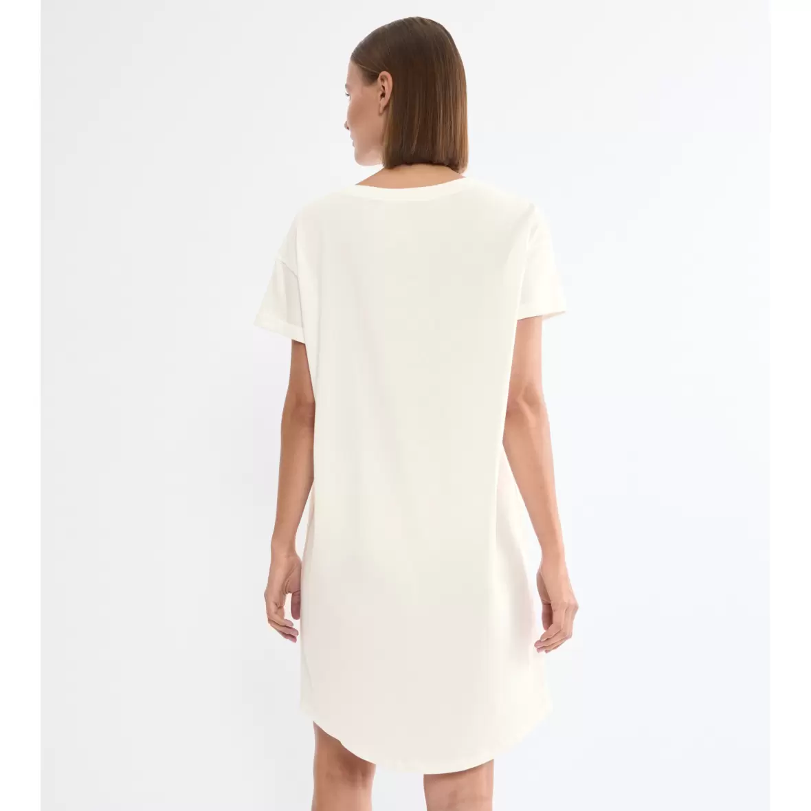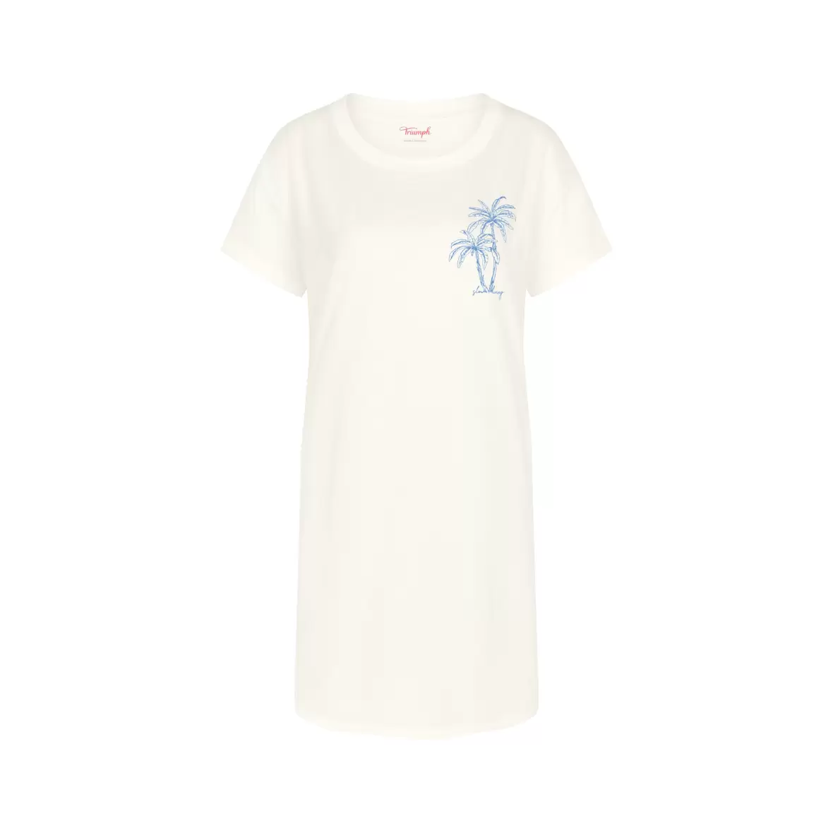 Klassisk natkjole fra Triumph med korte ærmer og tekst på brystet. Denne natkjole er i en smuk lys farve. Den ribbede ovale halsudskæring giver et feminint touch, mens den runde kantafslutning sikrer en behagelig pasform. Uanset om du skal slappe af derhjemme eller sove, så er denne kortærmede natkjole det ideelle valg.Materiale: