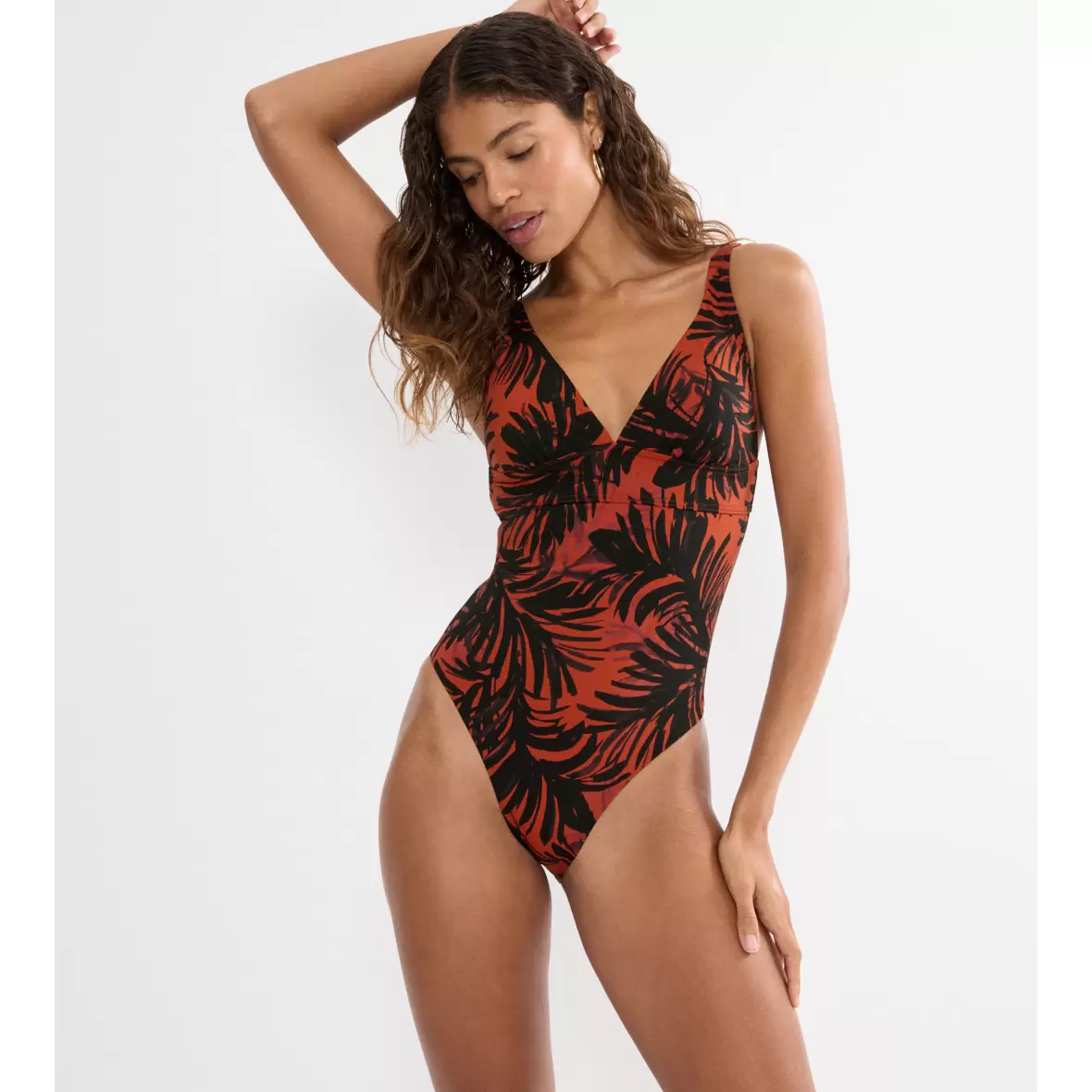 Denne skønne badedragt er en del af Triumphs populære Summer Palm kollektion. Med et smukt brunt palmeprint bringer den et tropisk touch til dit sommerlook, hvilket gør den til et must-have i din badetøjsgarderobe.Badedragten har en flatterende v-halsudskæring og er udstyret med vattering, der giver ekstra komfort og støtte. Den har justerbare stropper, så du kan tilpasse den, uanset om du slapper af ved poolen eller udforsker stranden.
