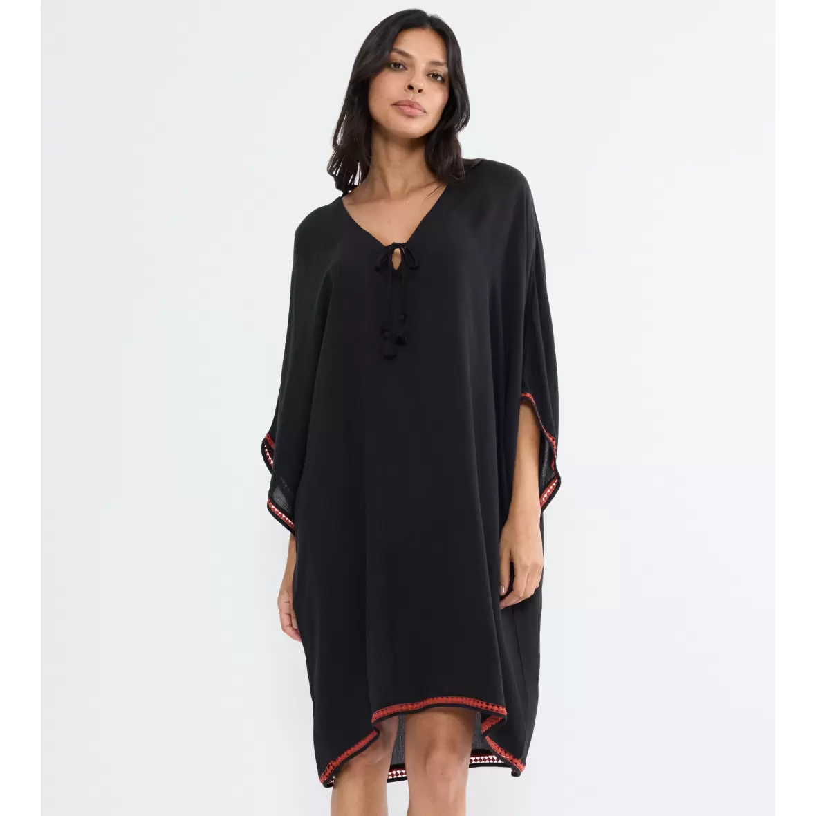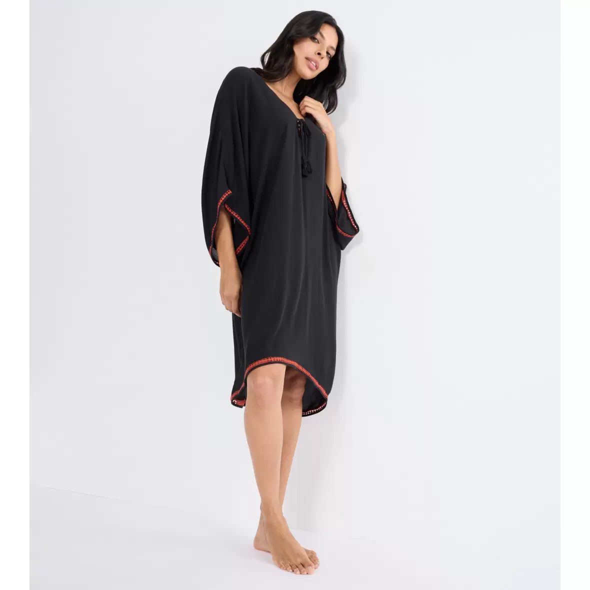 Denne alsidige korte kaftan er designet til at give dig en luftig og let fornemmelse, perfekt til varme dage ved vandet. Med dekorative kanter på de korte ærmer og en dyb V-udskæring, vil du føle dig både komfortabel og stilfuld, uanset om du slapper af på stranden eller nyder en drink ved poolen. Den er i klassisk sort og en del af Triumphs Beach MyWear kollektion.Kaftanen har et elegant bindebånd midt foran, prydet med kvaster, som tilføjer et ekstra touch af charme til dit strandoutfit. Den er ideel til at smide over badetøjet, når du skal fra stranden til en frokost med vennerne eller en aftenudflugt.