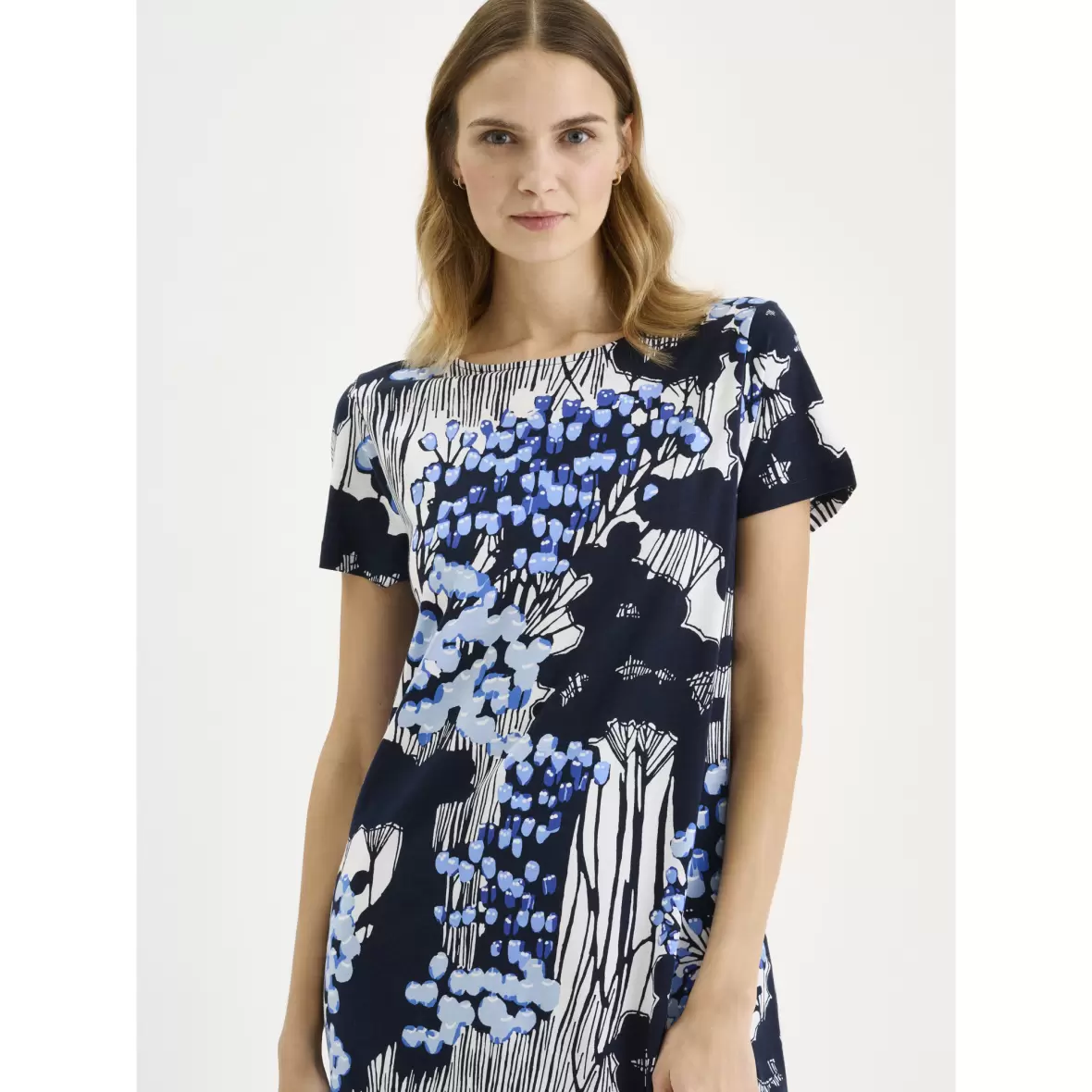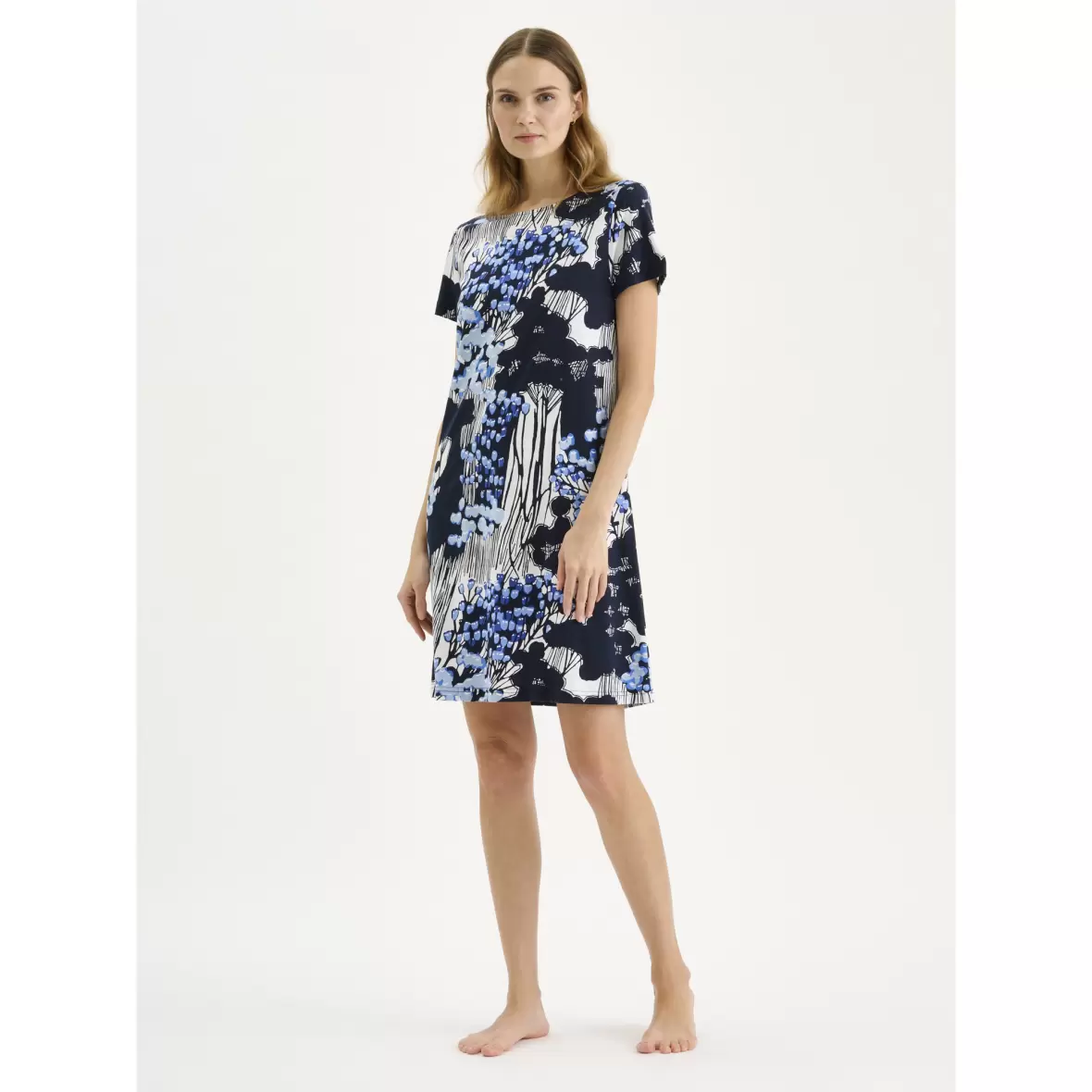 Opdag den smukke Kirjokerttu natkjole fra det anerkendte mærke Nanso, og giv dit nattøj en opgradering. Denne natkjole er en del af Nanso's populære Kirjokerttu serie, der skiller sig ud med sit unikke og iøjnefaldende mønster. I flotte blå nuancer tilføjer den et friskt pust til din aftenrutine. Natkjolen har en komfortabel pasform og en længde på ca. 95 cm i størrelse M, hvilket gør den perfekt til både varme sommernætter og hyggelige aftener derhjemme. De korte ærmer giver god bevægelsesfrihed, så du kan slappe af i stil.Materiale: