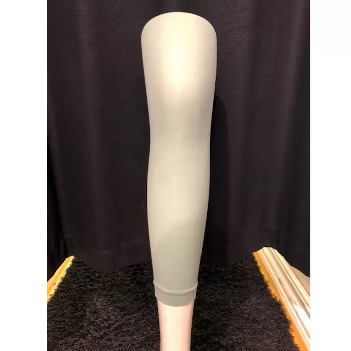 En kort lysegrøn nylon leggings i 40 denier, som går ned under knæet. Den har en bred kant i livet og en bred kile bagpå.