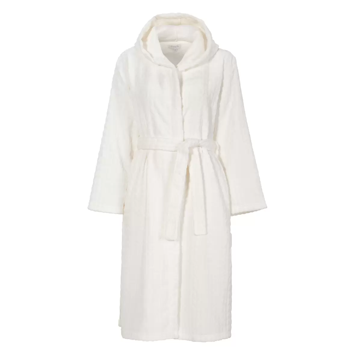 Damella lang badekåbe i den flotteste neutrale råhvide farve. Mellemlang morgenkåbe med bindebånd, hætte og lommer i siderne. Blød og let kåbe til kvinder. Flot farve og elegant mønster. Nem at vaske og vedligeholde.