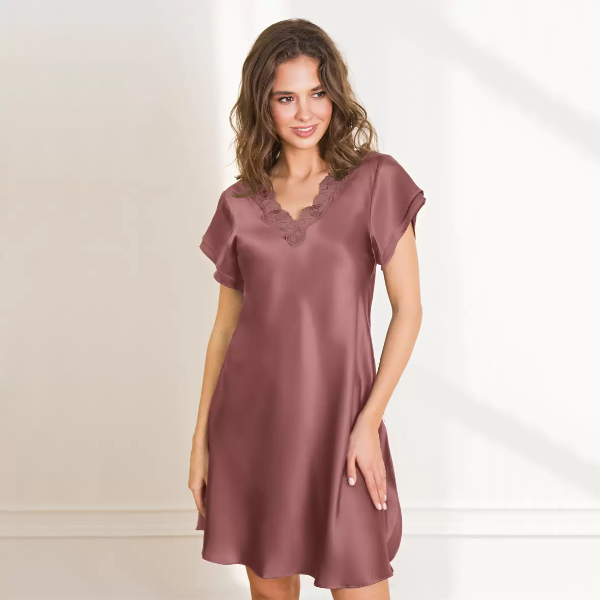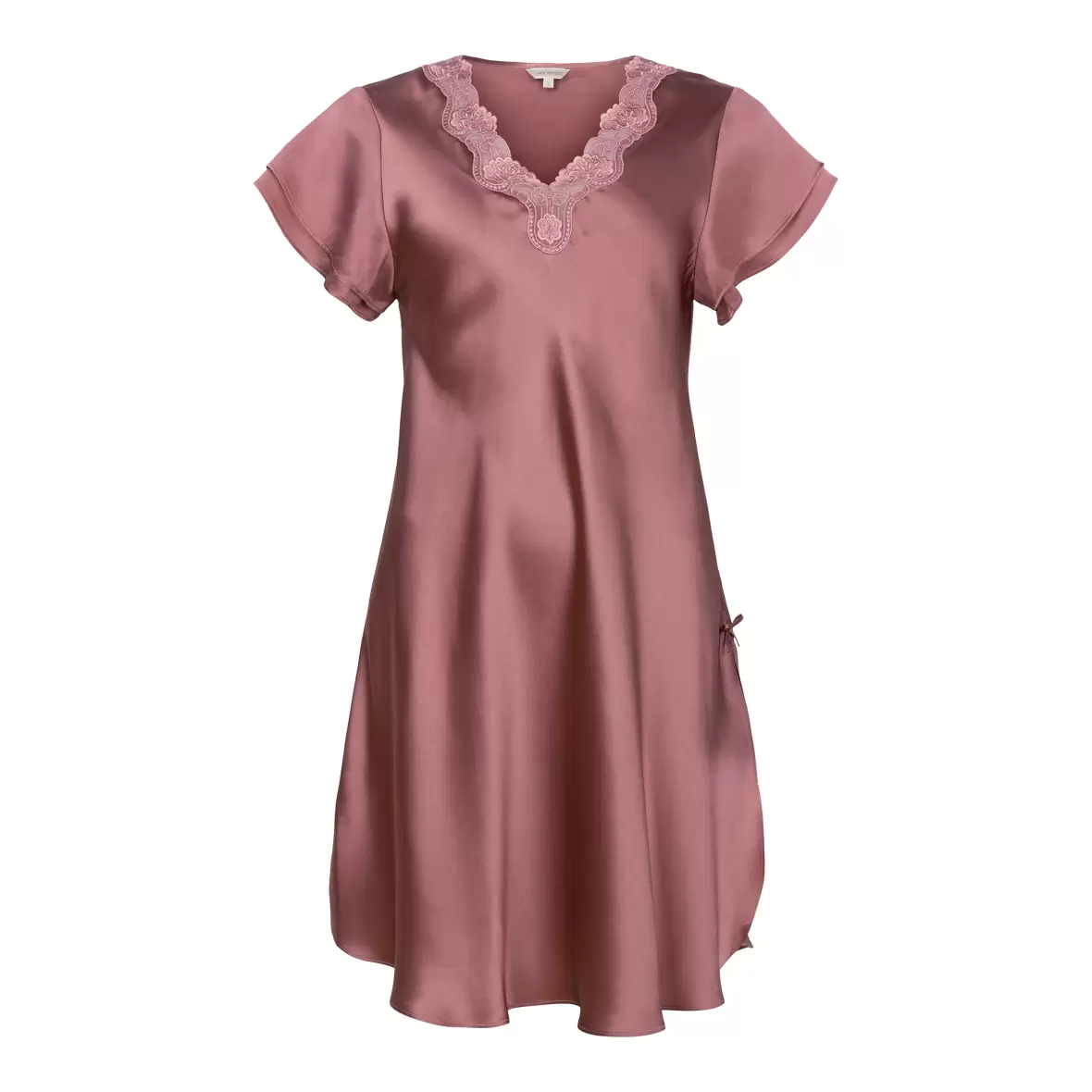 En elegant silkekjole med korte ærmer. Kjolens halsudskæringen er V-formet med en bred og transparent blonde. Ved det venstre ben har kjolen en slids med en lille sløjfe over. Kjolen kan med fordel både bruges som en underkjole og en natkjole.