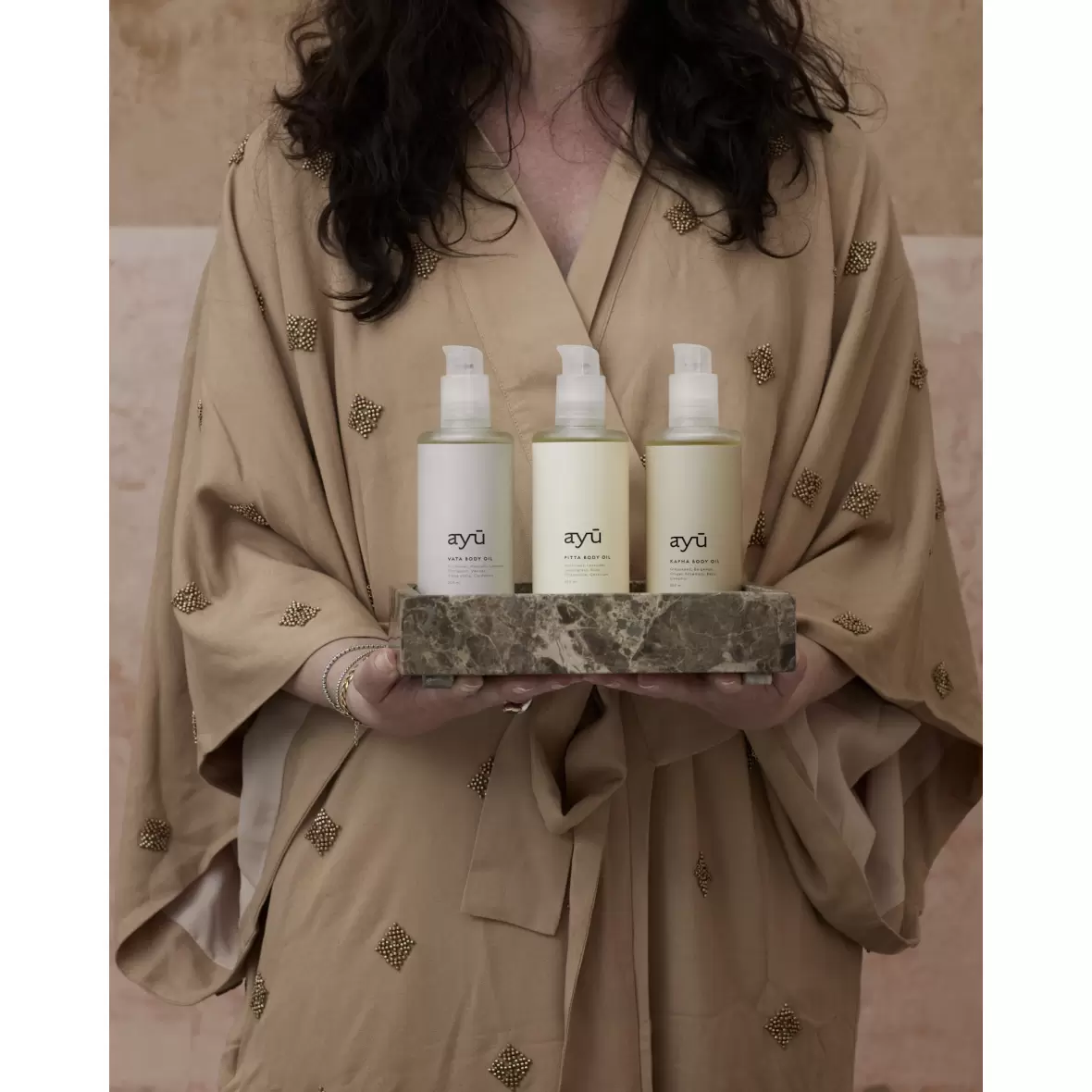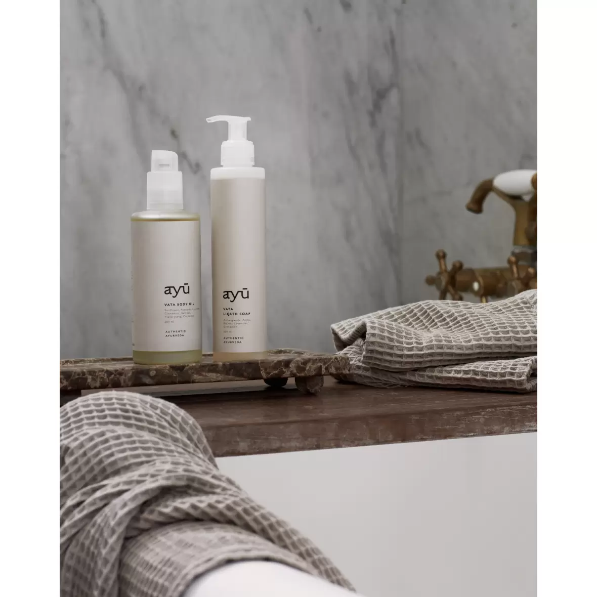 Denne nærende og plejende Vata kropsolie efterlader din hud blød, glat og smidig. Olien er en blanding af solsikke-, avocado-, sesam- og mandelolie. Vata olien tager udgangspunkt i æteriske olier, som har aromaterapeutiske egenskaber, der fremmer nærvær, stabilitet og jordforbindelse. Olien har en unik, varm og beroligende duft, som indeholder balancerende æteriske olier fra lavendel, kanel, vetiver, ylang-ylang og kardemomme.Materiale: