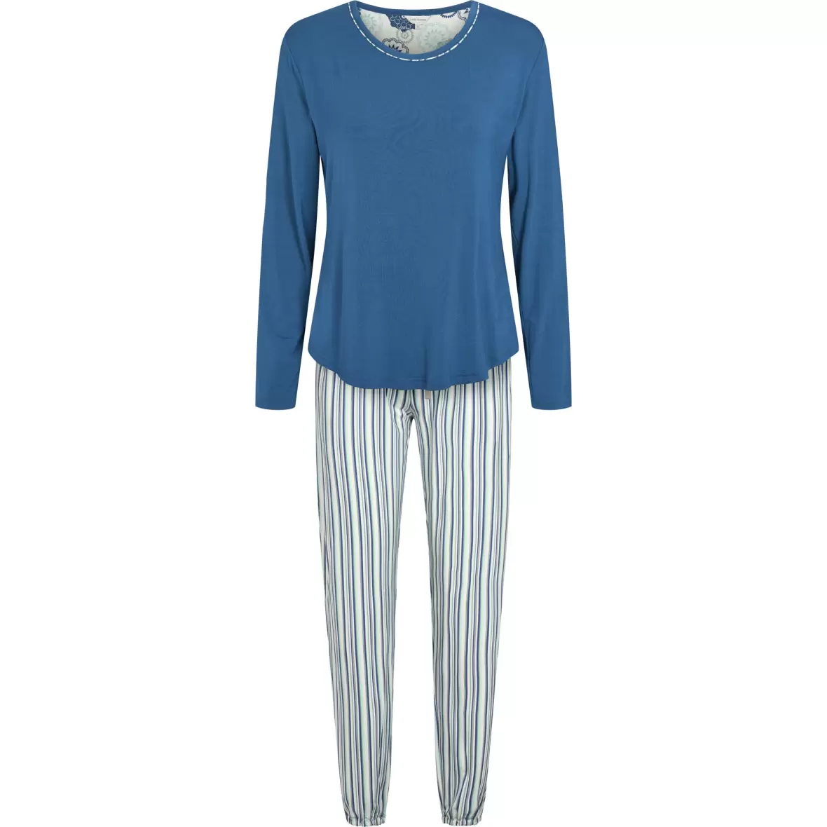 Denne pyjamas er i en dejlig bambus kvalitet. Blusen har langeærmer og en rund halsudskæring i en fin blå farve.Bukserne er stribet med lommer og en elastikkant i livet.