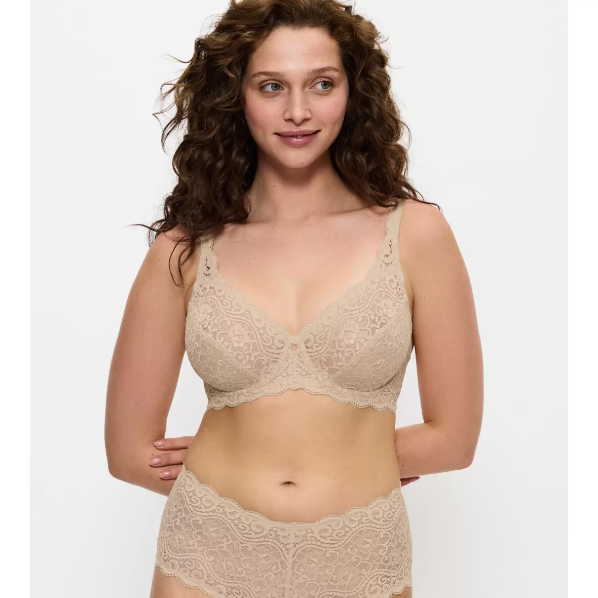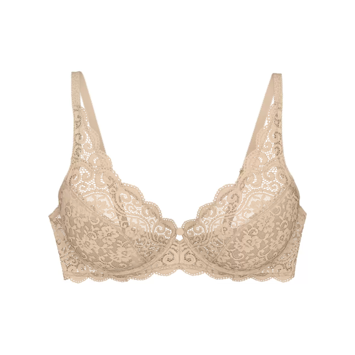 En bh med bøjle og uden vattering, i en nude farve. Skålen er inddelt i to, den nederste del af skålen har to lag, for at give barmen en god support.Den øverste del af skålen er en blonde, som lægger sig til huden for at sikre en flot afslutning under tøjet.
