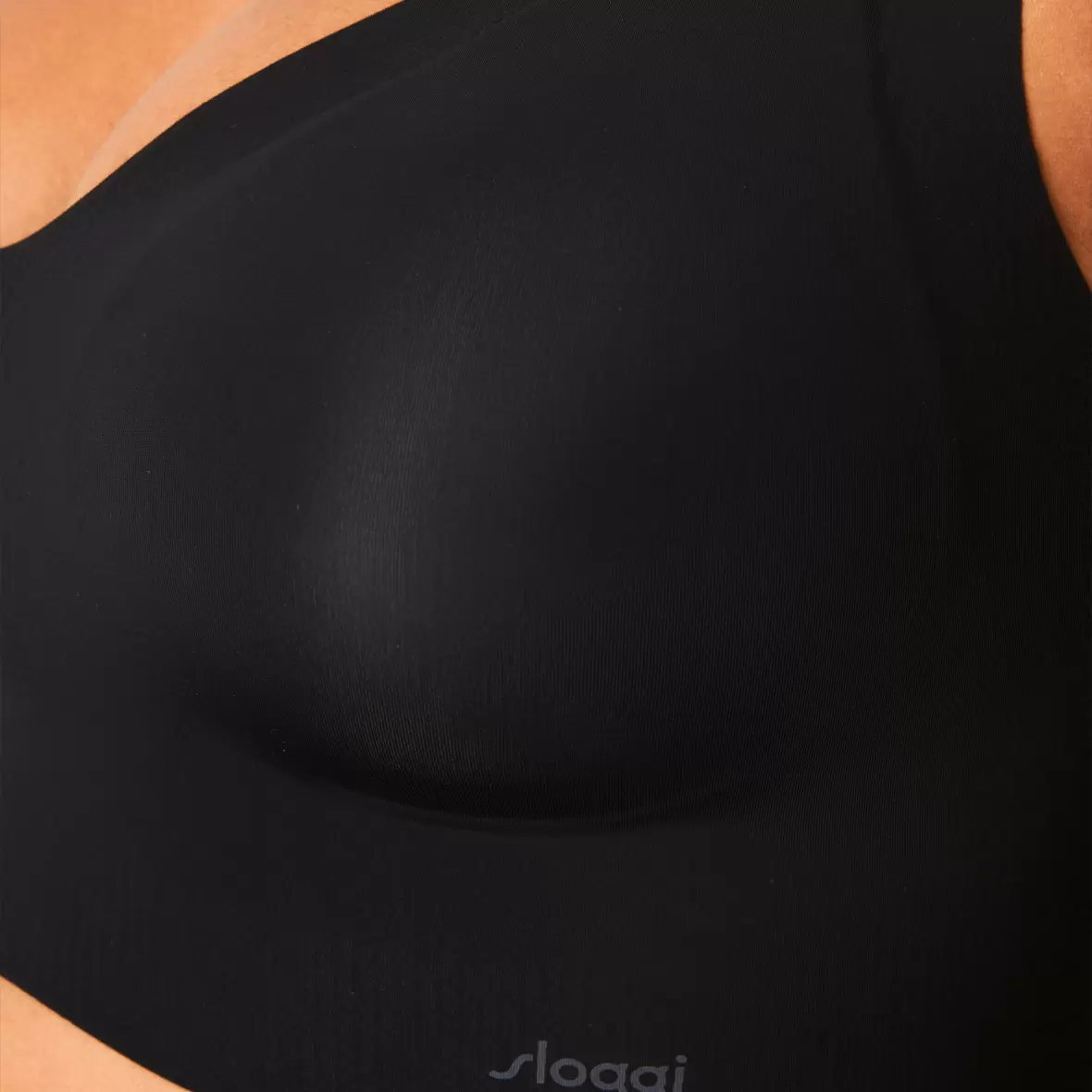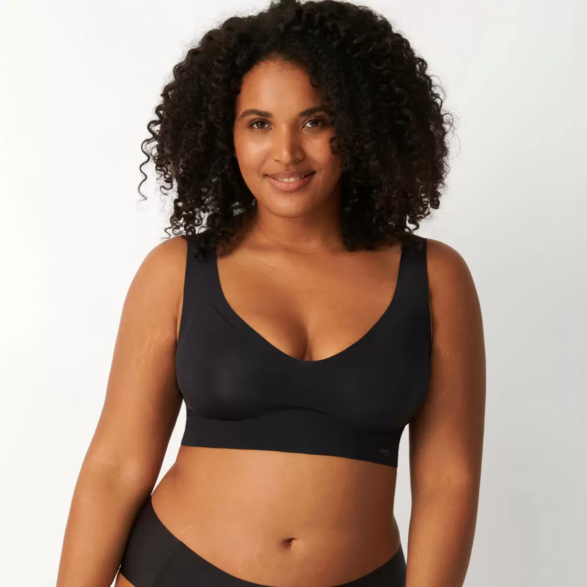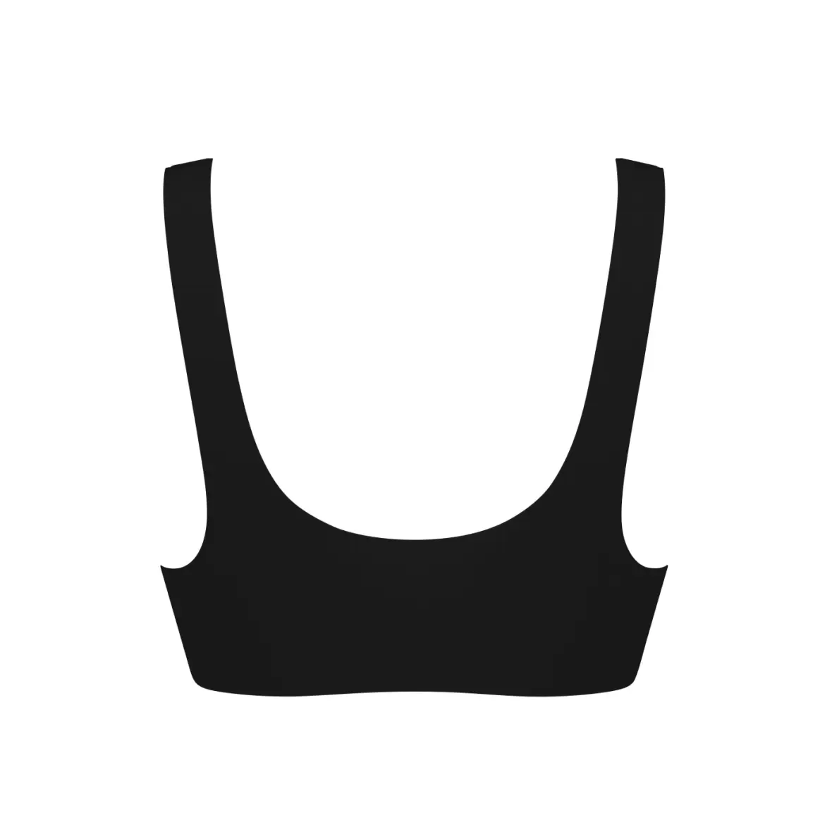 En top uden bøjle og med push vattering. Toppens vattering er to puder, som kan tages ud af toppen. Kanterne er sømløse, og stropperne er brede. Toppen er limet sammen i siderne, og du undgår derfor synlige kanter under tøjet.