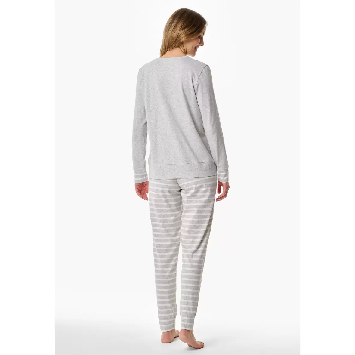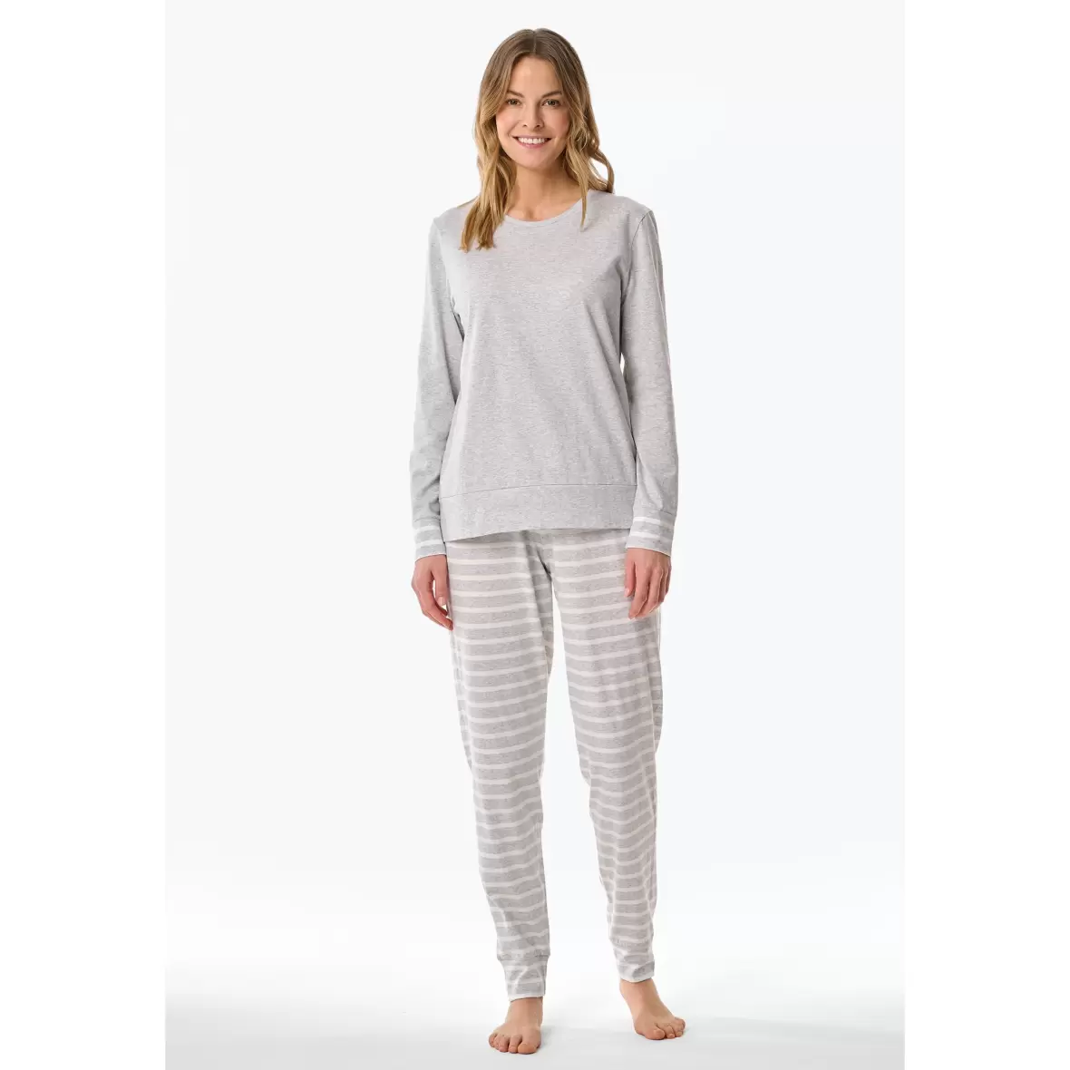 Denne Pyjamas er med lange ærmer og lange bukser. Blusen er en ensfarvet grå farve, og bukserne er i et stribet mønster.Afslutningen på ærmerne og bukserne er lavet i en "bred kant".
