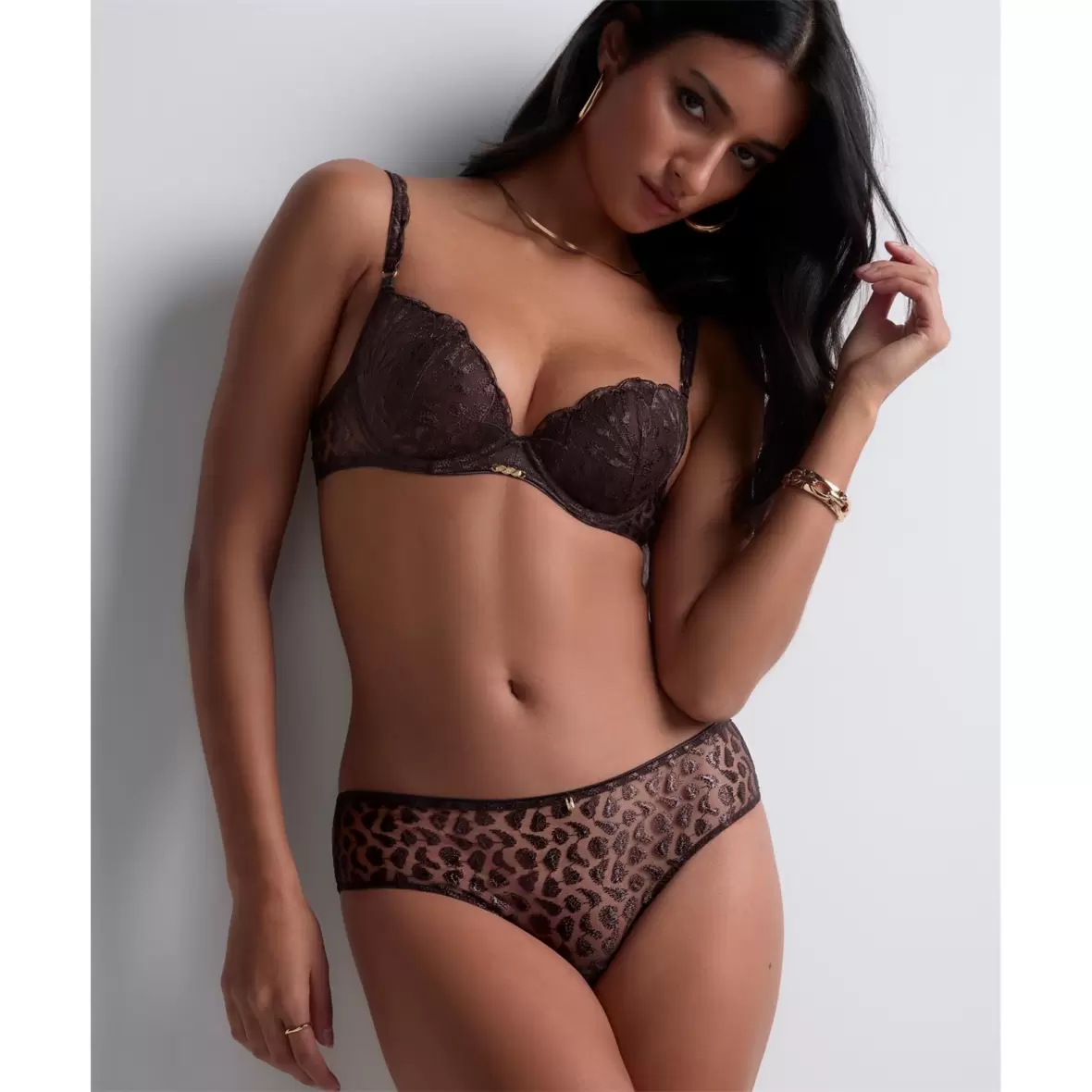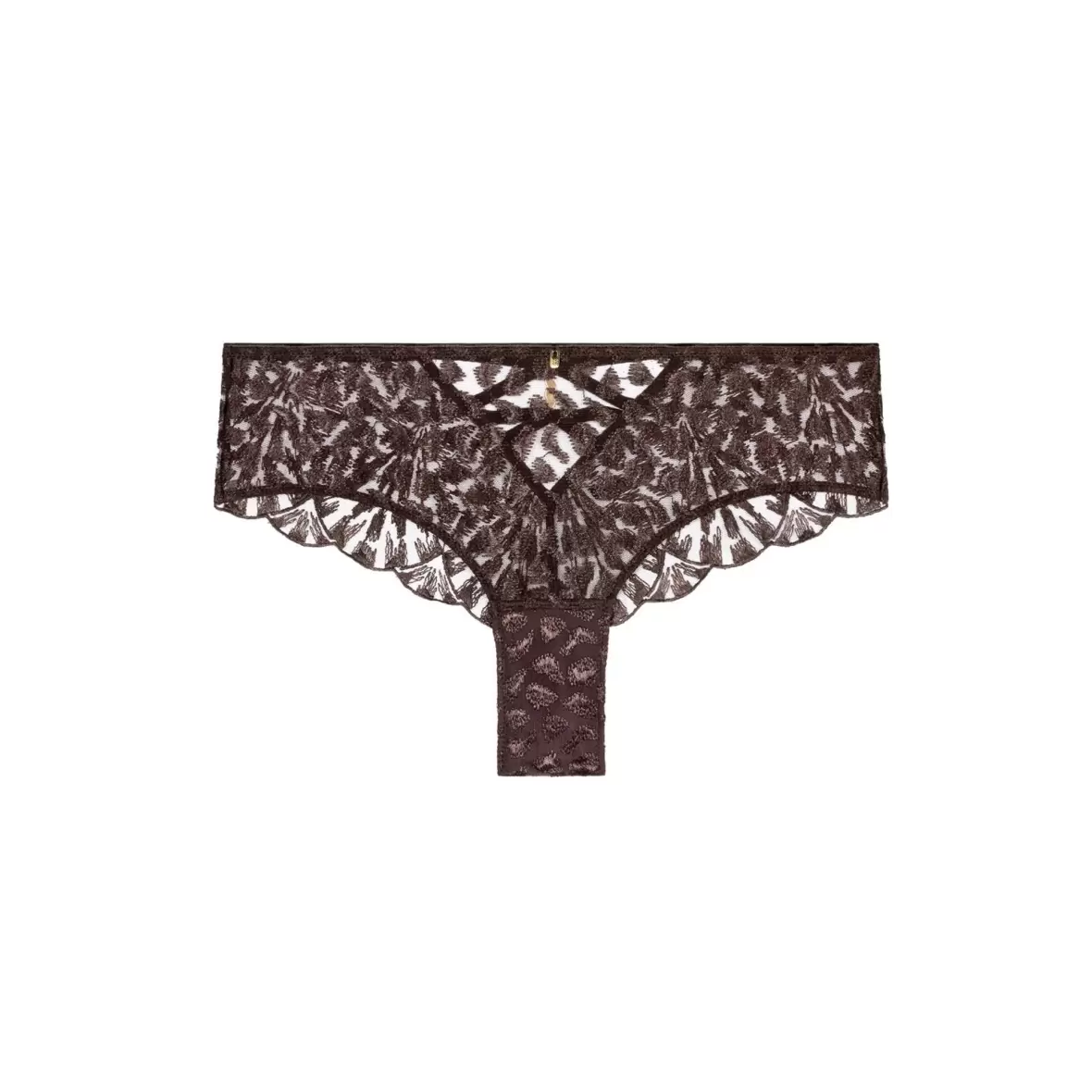 En smuk hipster trusse i en mørkebrun farve. Trussen har en fin blondekant bagpå, som ligger sig til huden. I livet har den en elastikkant med et smukke både foran og bagpå.