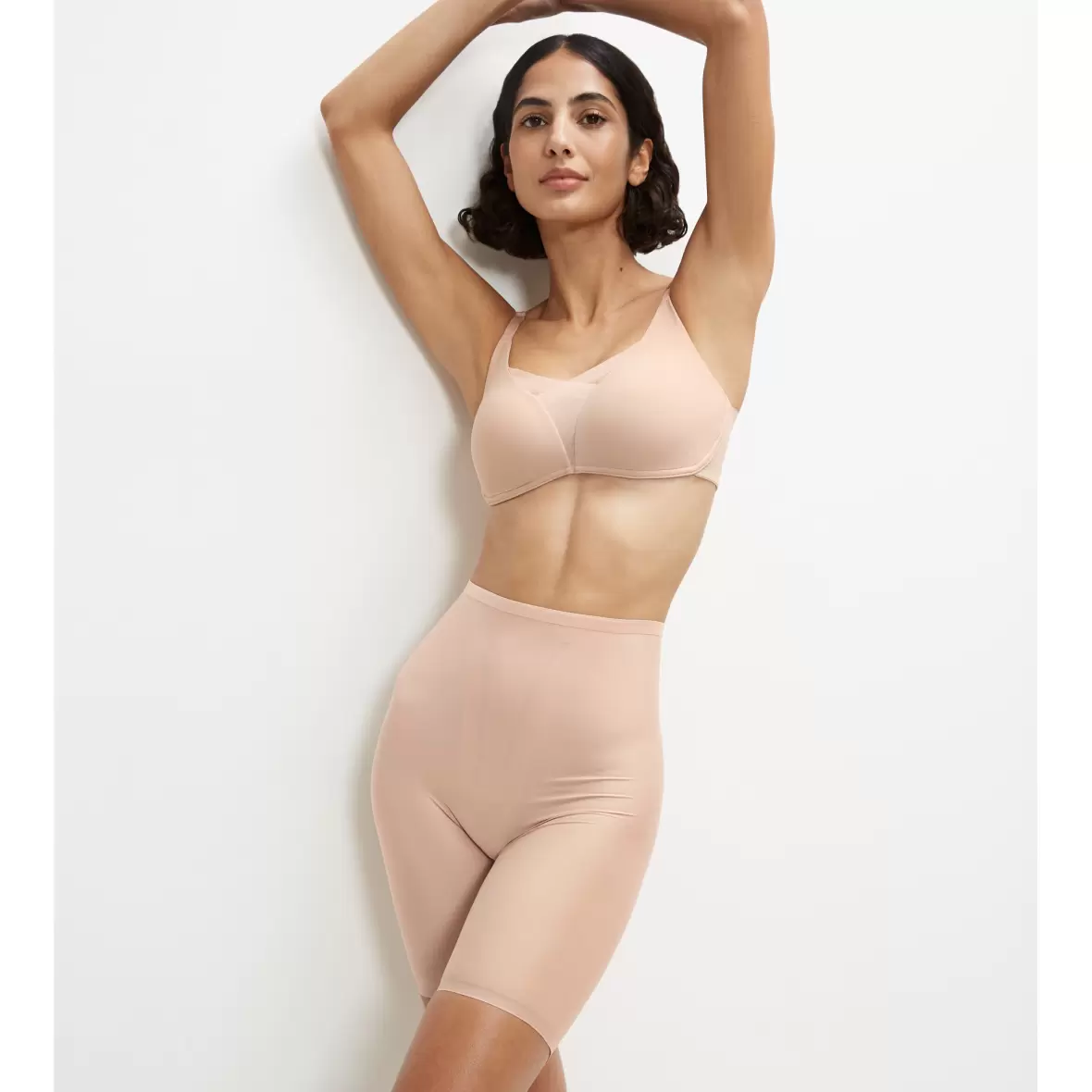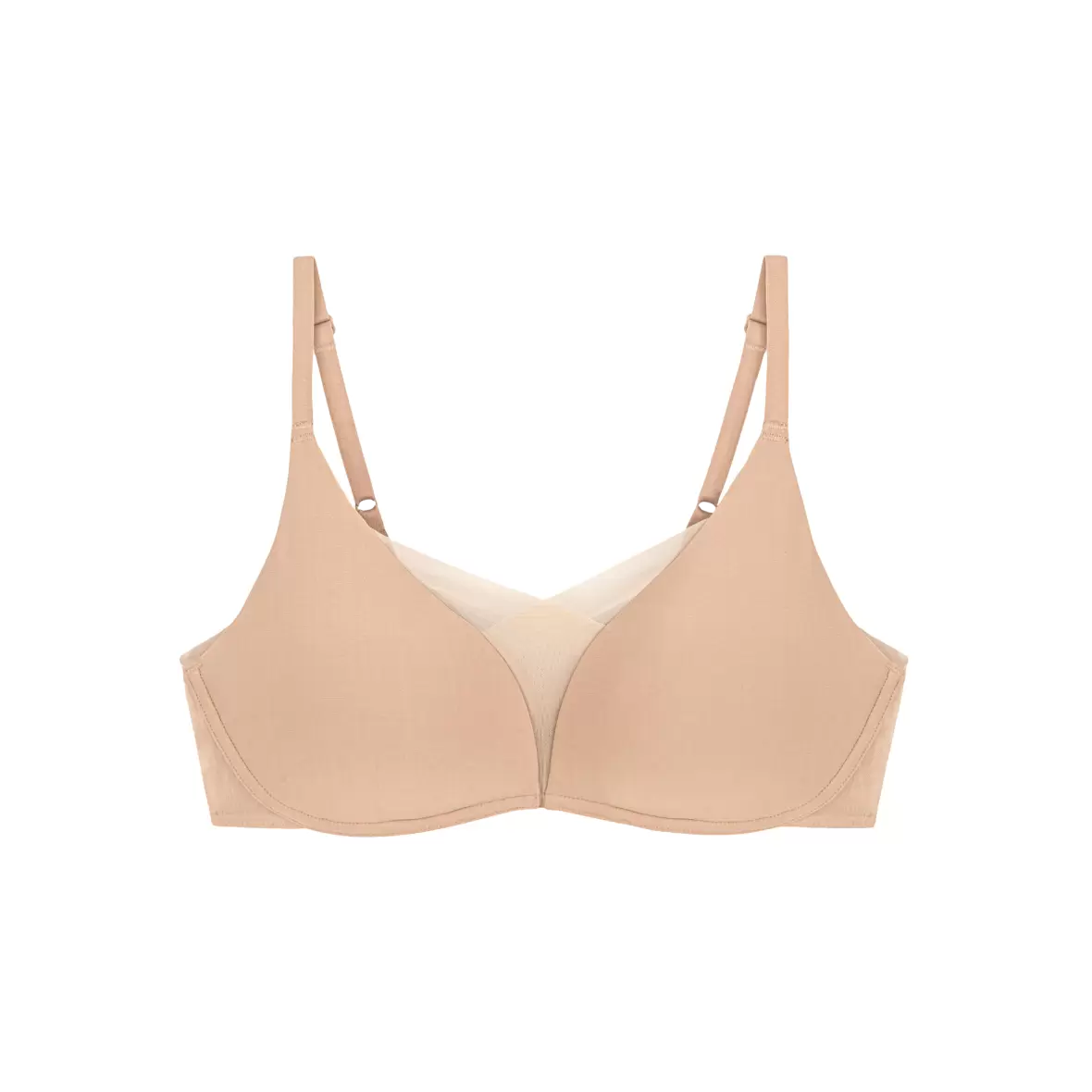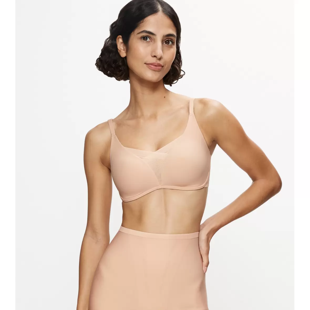 En BH uden bøjle og med vattering. Denne BH har et krydsende mesh foran som går ned i en dyb v-udskæring, hvilket sikre en god støtte og giver et let udtryk. Stoffet er helt glat og linningen er bred med en mesh bagpå.Materiale: