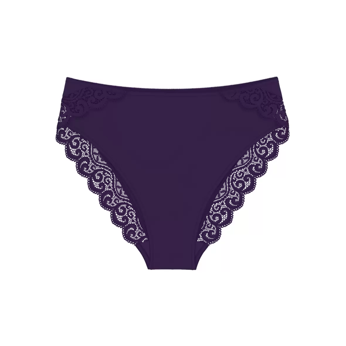 Denne lilla tai trusse har i siderne og bagpå en smuk og transparent blonde. Resten af trussen er en glat kvalitet og har en elastikkant i livet.Materiale:
