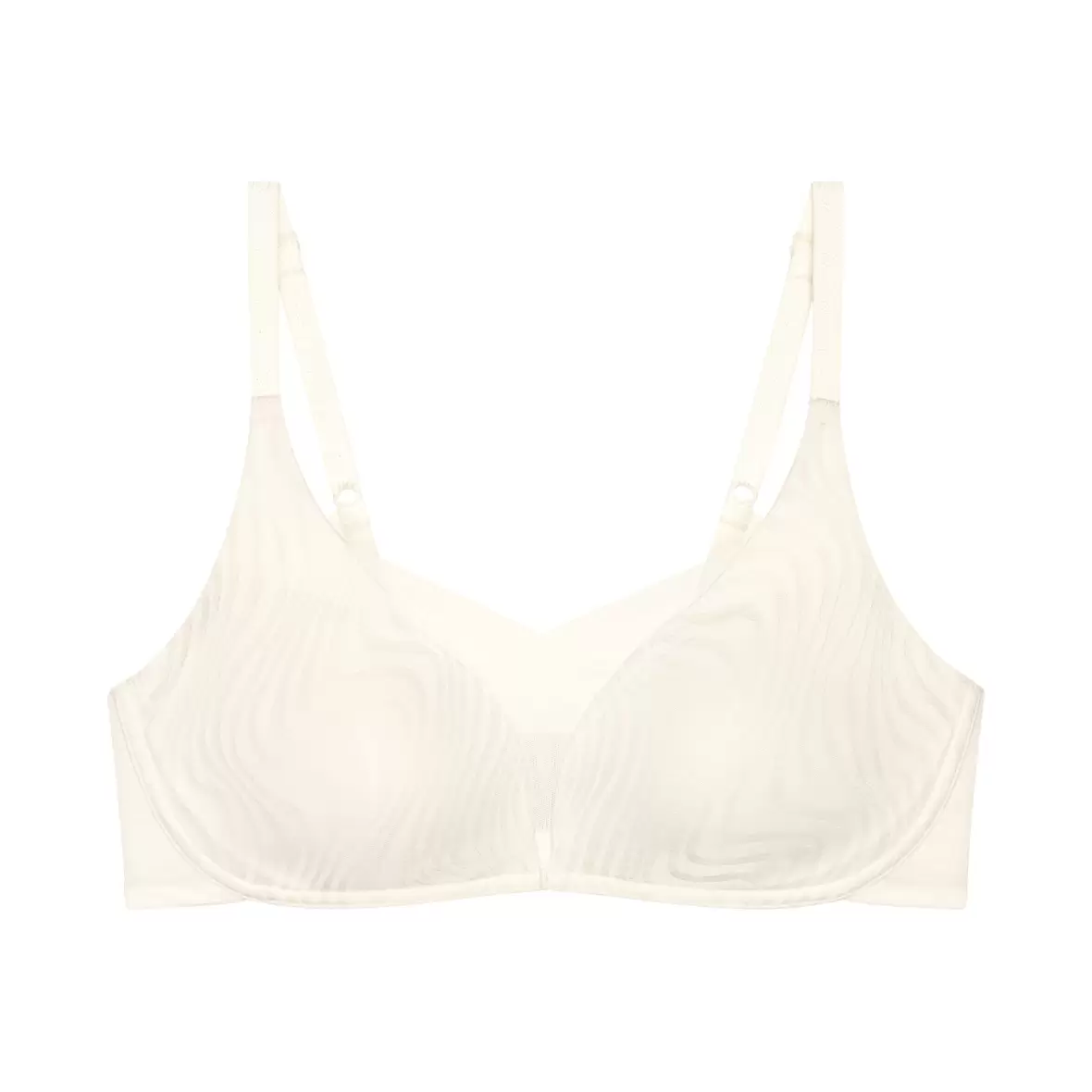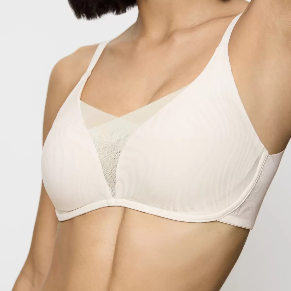 En BH uden bøjle og med vattering. Denne BH har et krydsende mesh foran med et fint print som går ned i en dyb v-udskæring, hvilket giver et let udtryk. Stoffet er helt glat og linningen er bred med en mesh bagpå.