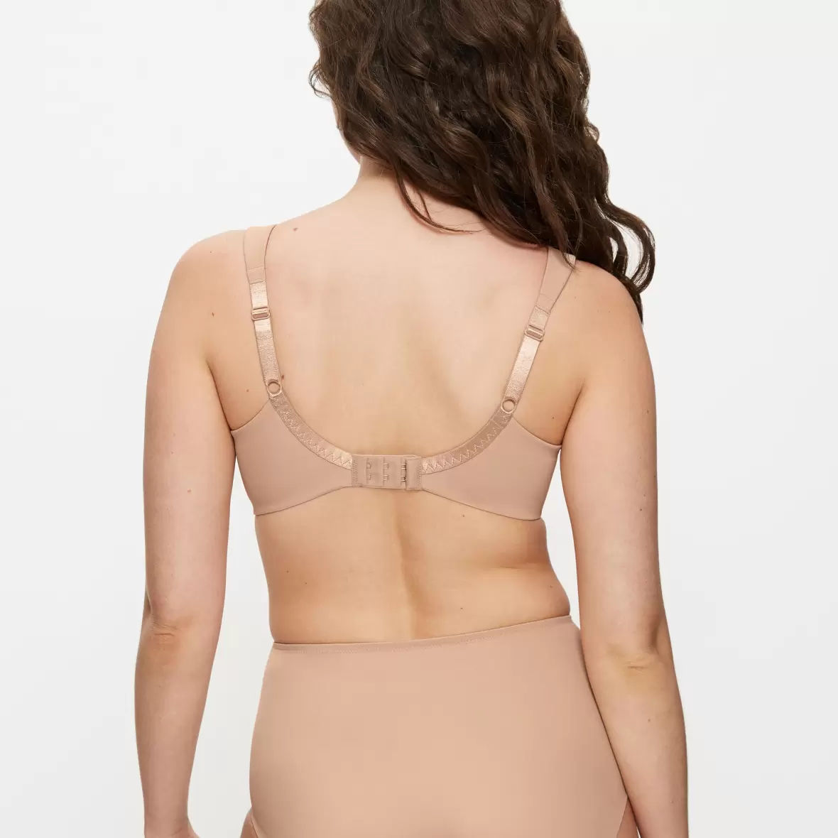 En BH med bøjle og uden vattering. BH'en er en minimizer med helt glatte skåle og en lille mesh kant, hvilket giver den et lettere udtryk. Den har en bred linning og brede justerbare stropper.