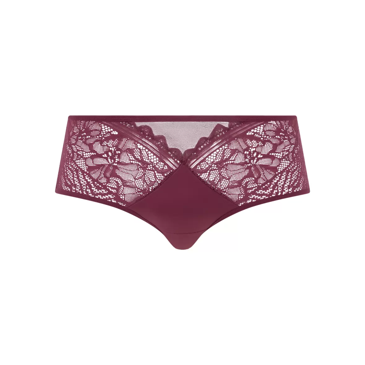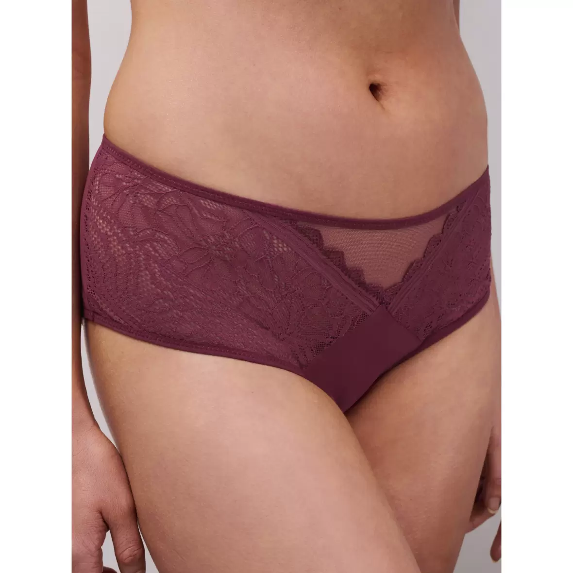 Denne fine hipster trusse har foran en transparent blonde med et mesh stykke i midten. Resten af trussen både foran og bagpå er i et blødt og uigennemsigtigt stof. Kanten i livet samt i benet er elastisk.Materiale: