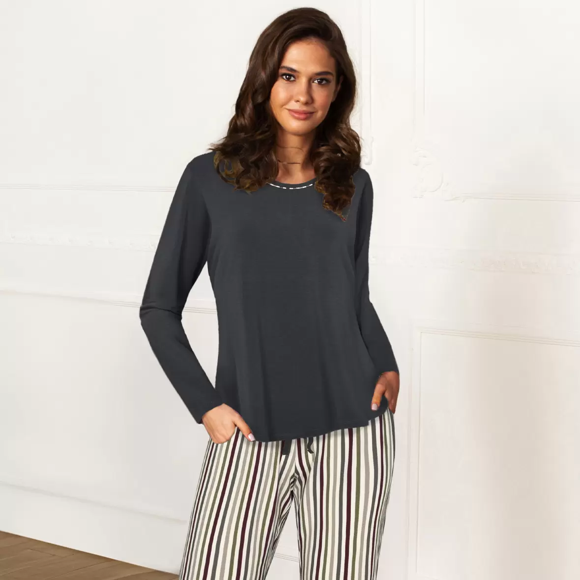 Denne pyjamas er i en dejlig bambus kvalitet. Blusen er ensfarvet med lange ærmer og en rund halsudskæring.Bukserne er lange med en elastikkant i livet, og stribet mønster.