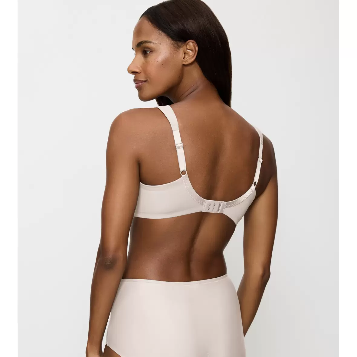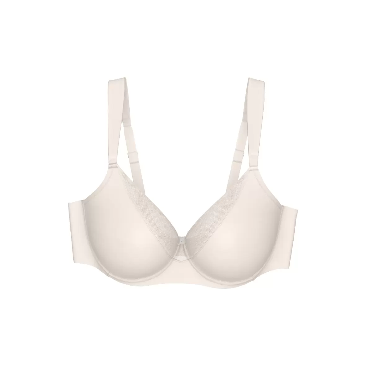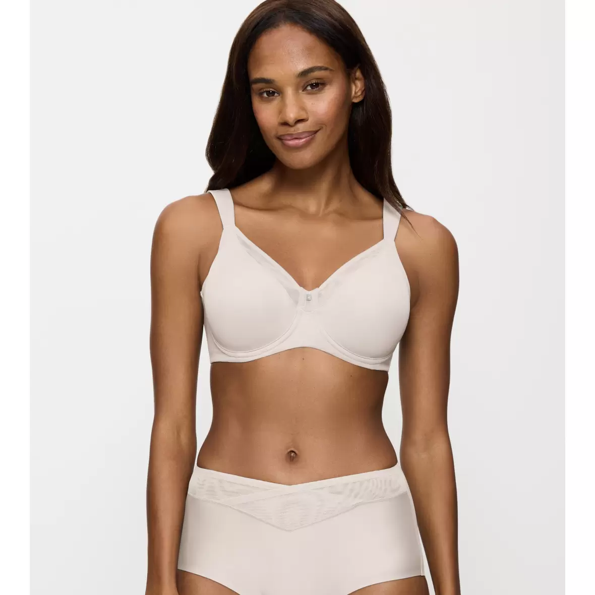En BH med bøjle og uden vattering. BH'en er en minimizer med helt glatte skåle og en lille mesh kant, hvilket giver den et lettere udtryk. Den har en bred linning og brede justerbare stropper.Materiale: