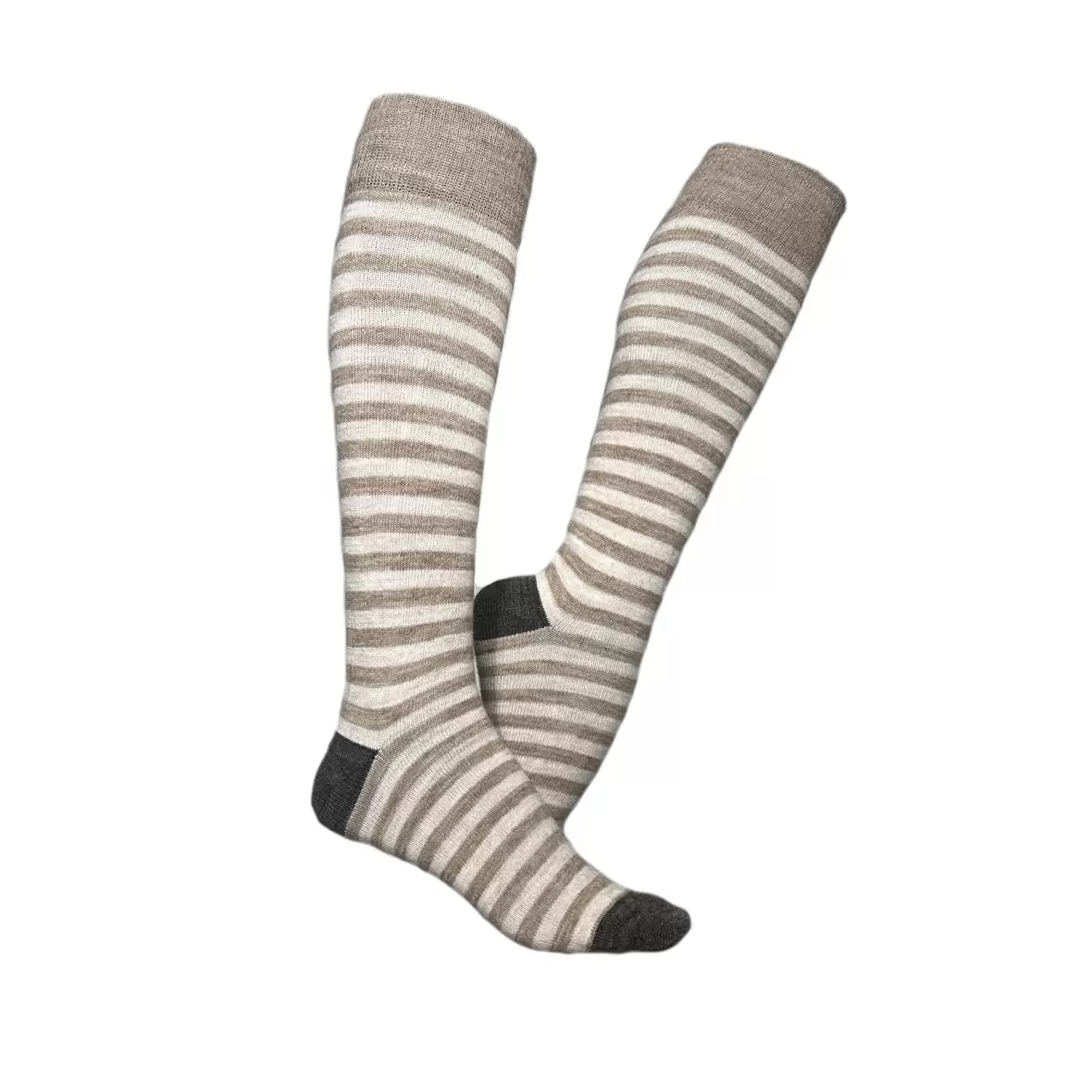 Disse knæstrømper er i en dejlig uld kvalitet med alpakauld.Strømperne har et stribet mønster.