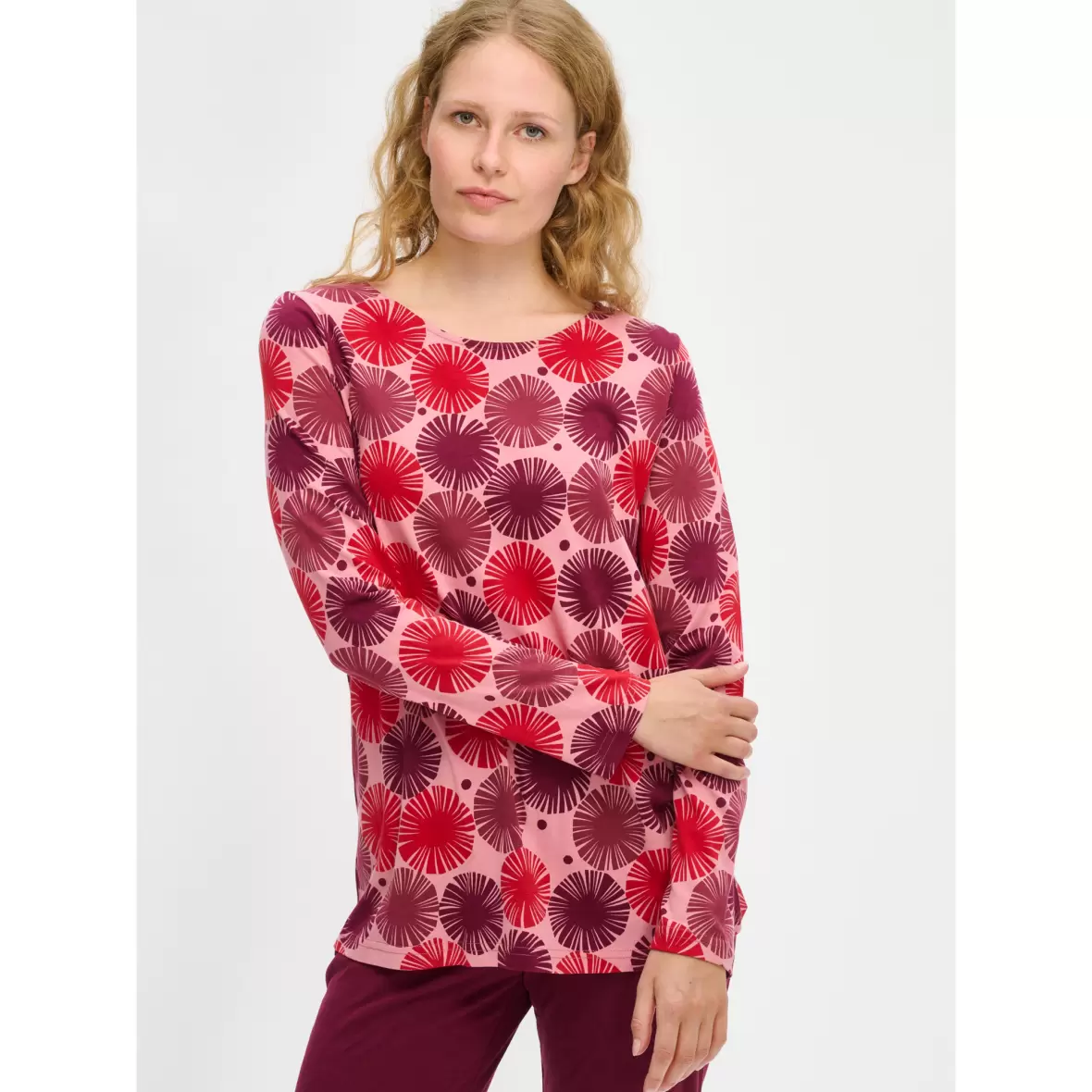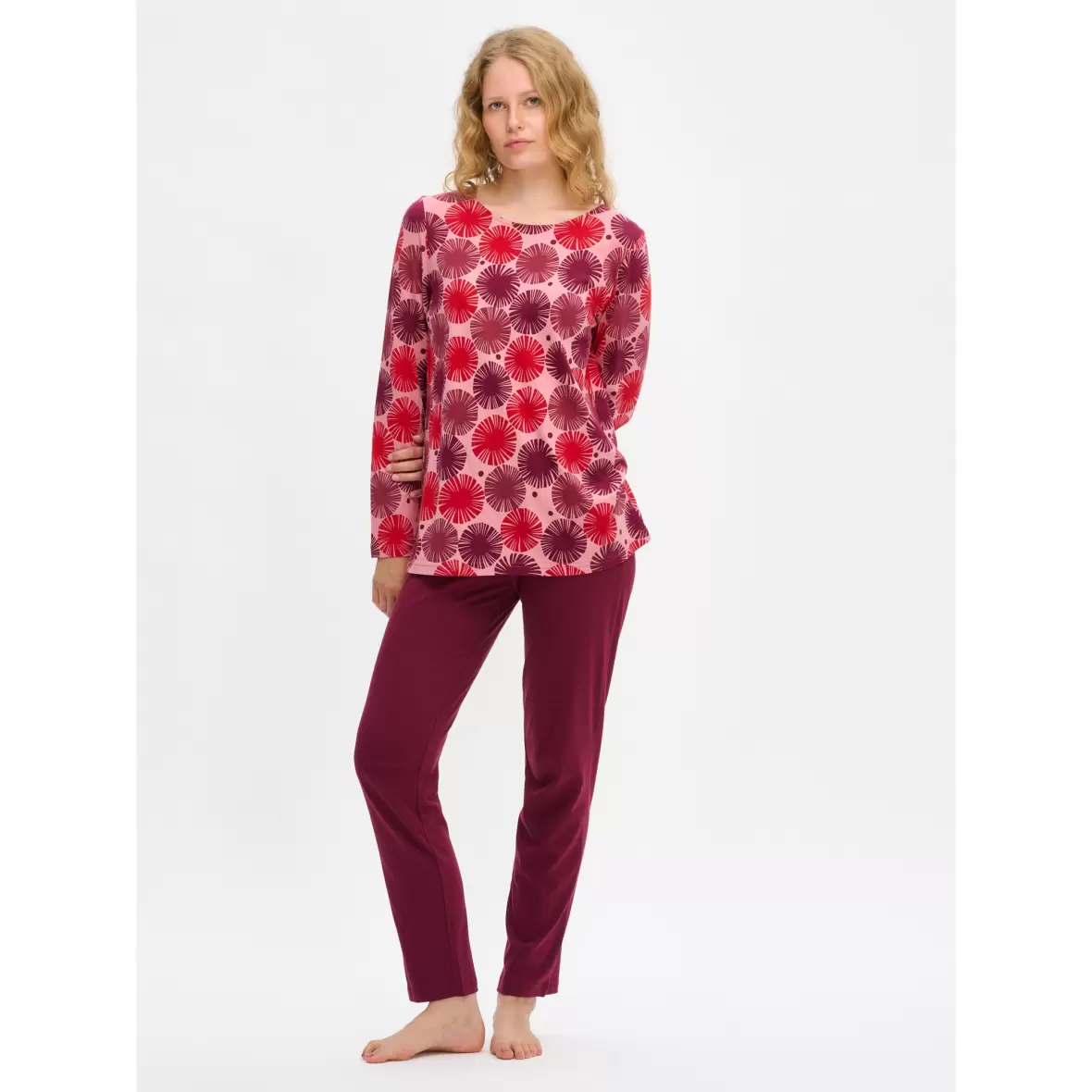 Blød og behagelig pyjamas med lange ærmer i en bomulds/modalblanding.Blusen har et smukt rødt print, samt en oval halsudskæring.
