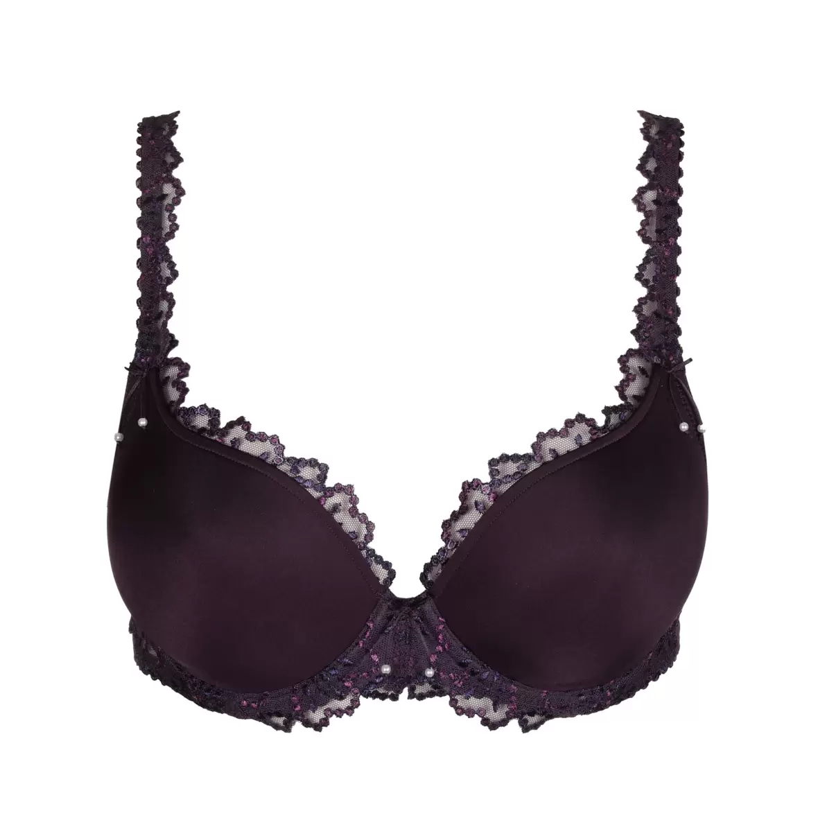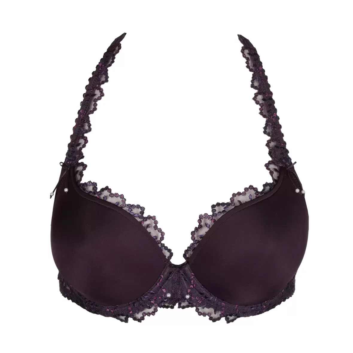 En BH med bøjle og vattering i en skøn mørkelilla farve. Jane-serien er kendetegnet med dens fine blonde, der ligger rundt i skålens kanter og på stroppen. Skålen er en hjerte-form. Stropperne kan laves om til en nakkestrop eller til kryds-ryg.Materiale: