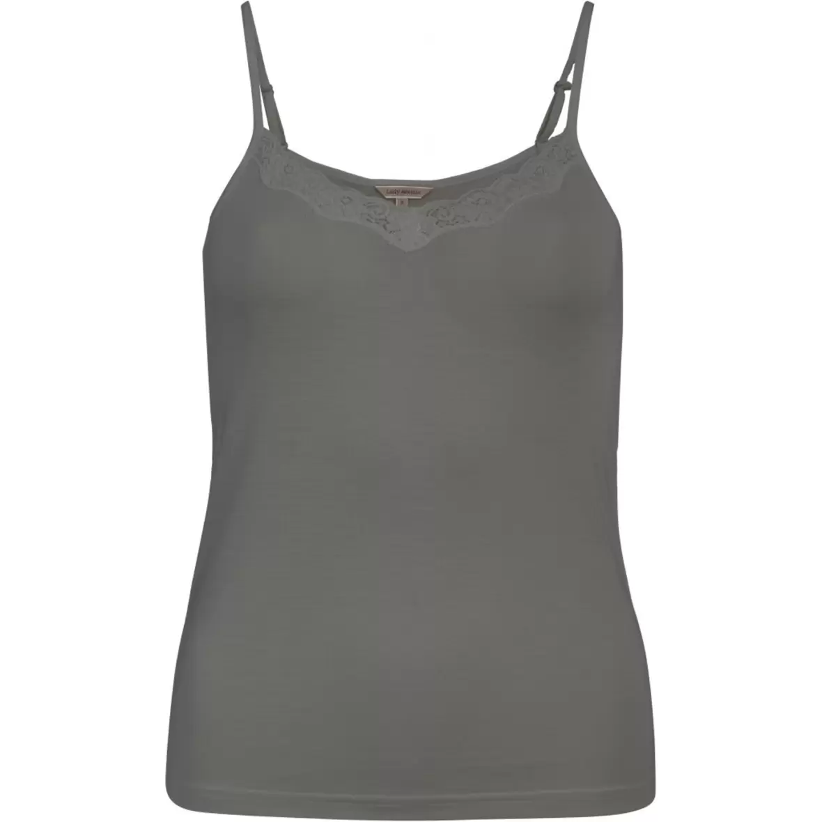 Denne skønne top er i en let og glat strikket silke kvalitet. Toppen har smalle stropper og en fin lille blonde i kanten ved brystet.Materiale: