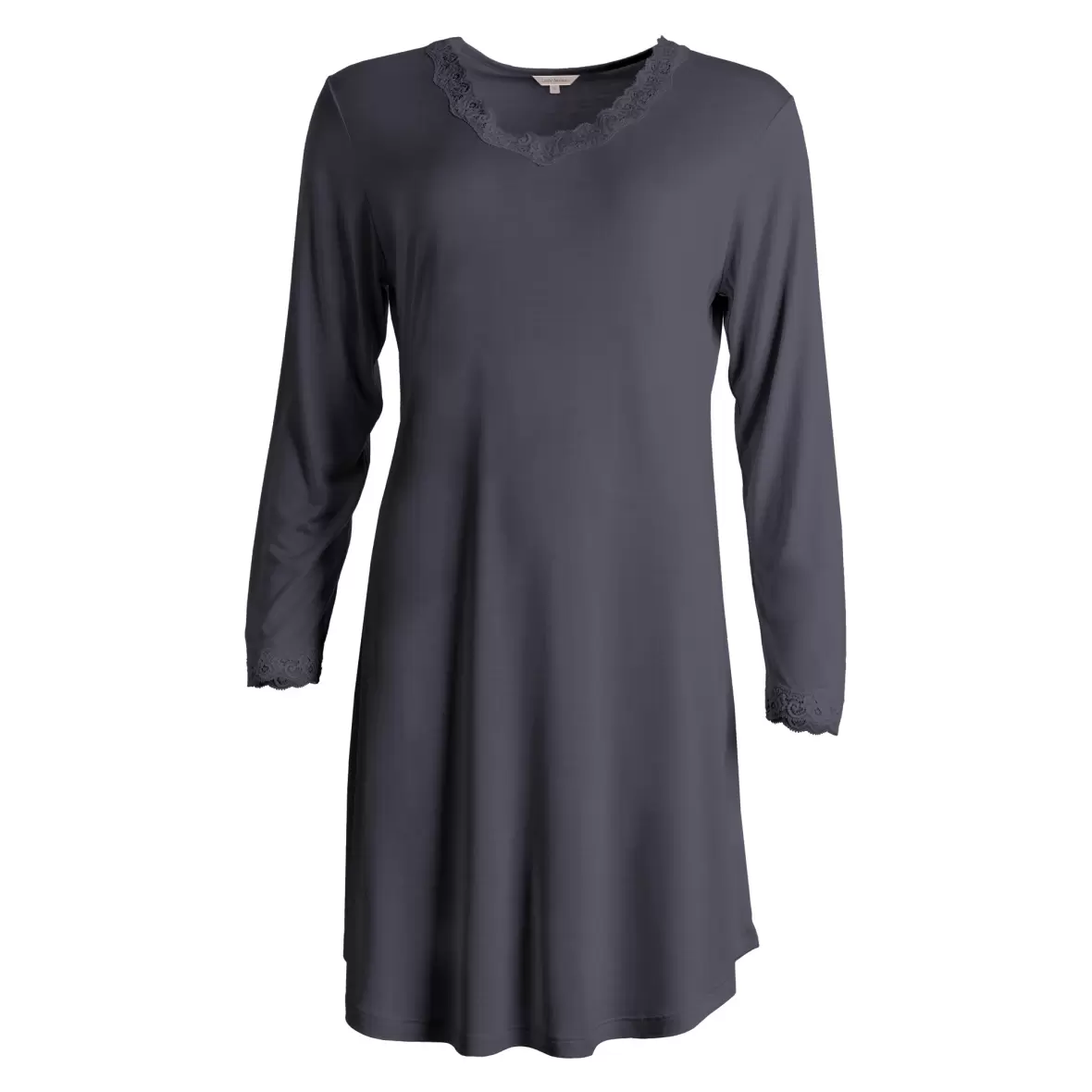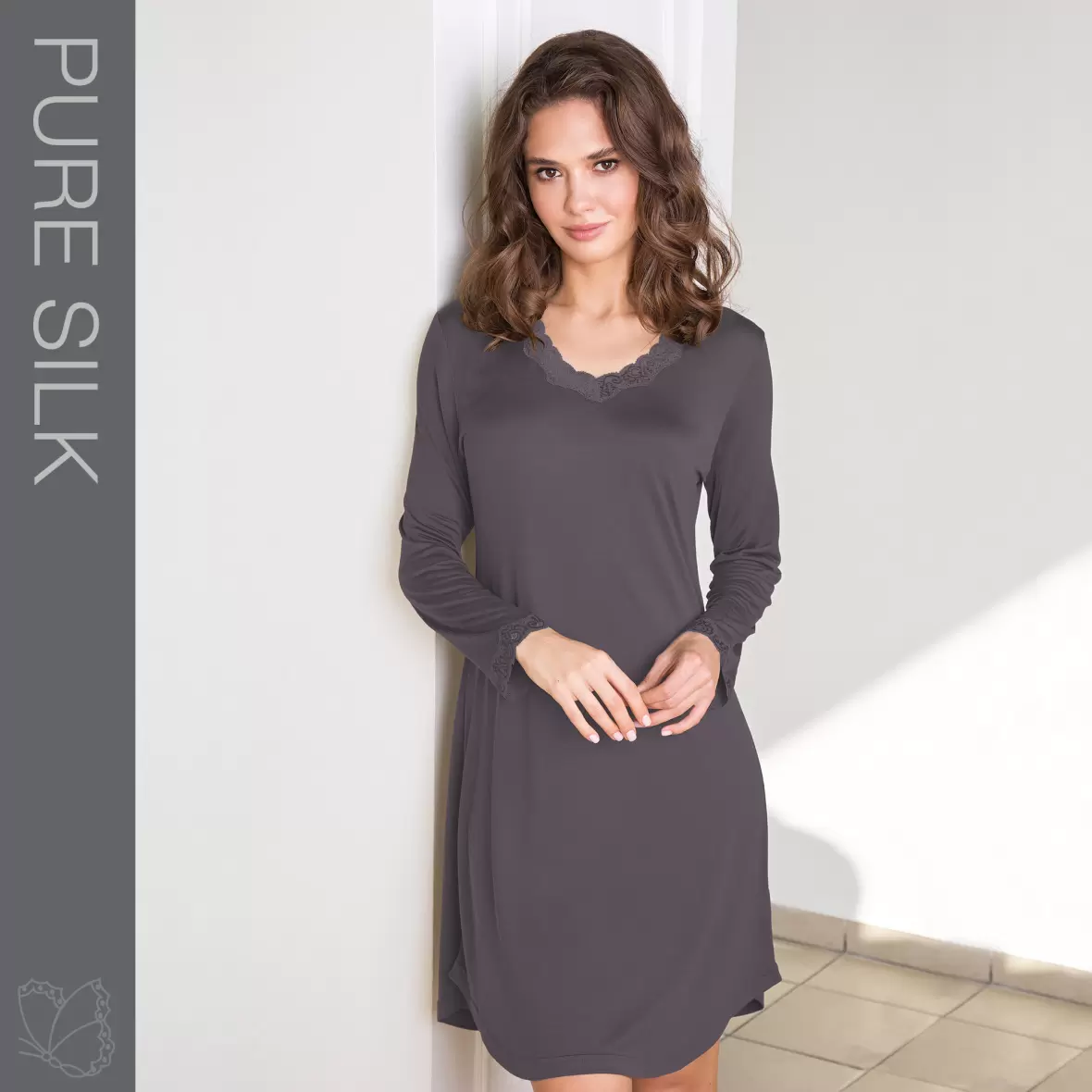 Kort natkjole med lange ærmer dekoreret med elegante blonder i ærmegab og ved v-udskæringen i halsen. Naturlig silke gør nattøjet temperatur-regulerende og en drøm at have på.Materiale: