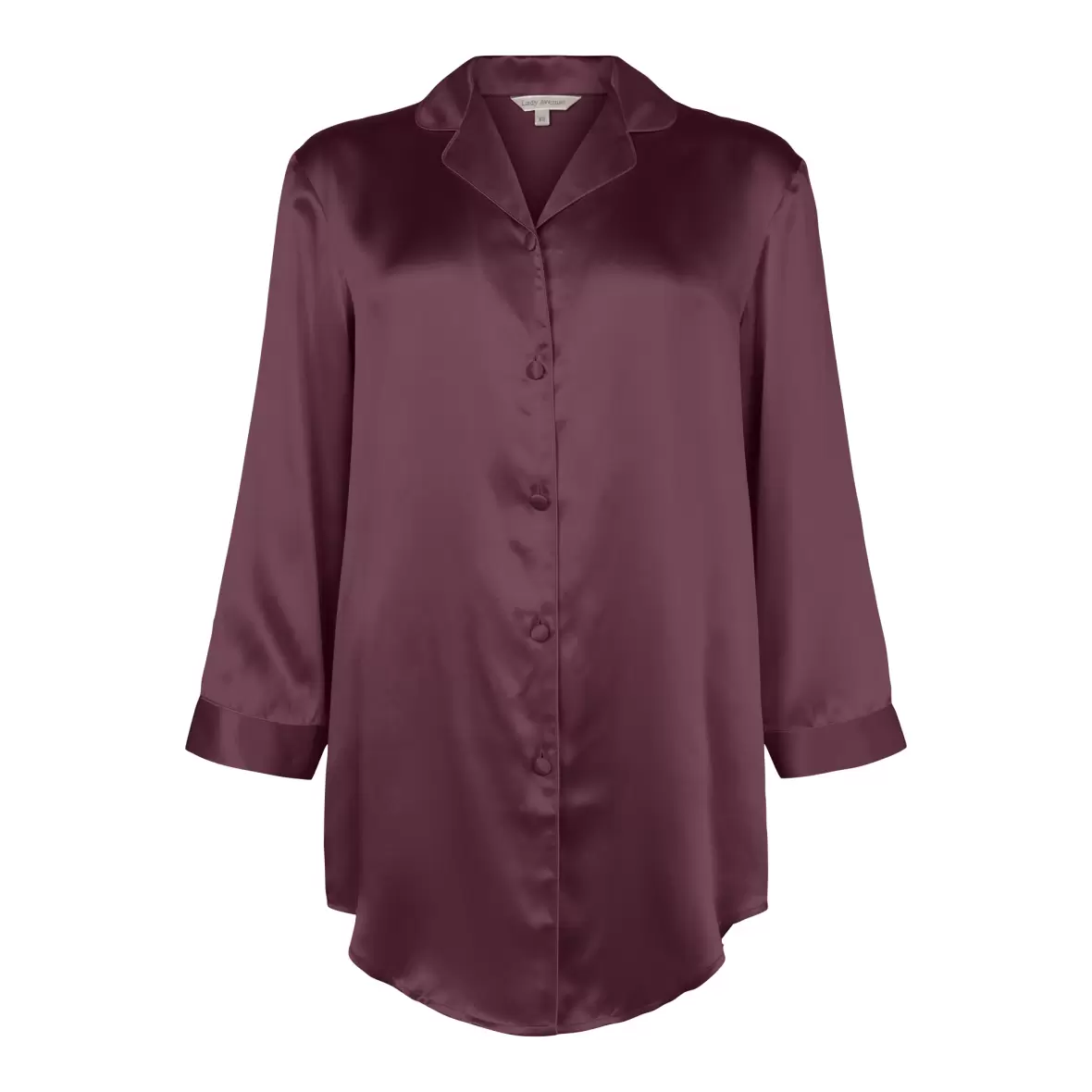Denne smukke og elegante skjorte er i ren silke. Den glatte silke giver en let fornemmelse på kroppen. Skjorten er mørkerød og har en bred krage med en v-halsudskæring, lange ærmer og knappeåbning foran.Materiale: