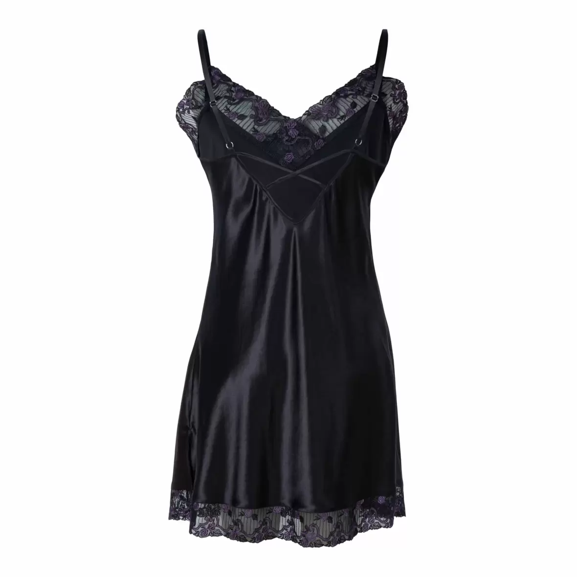 En elegant sort silkekjole med smalle stropper. Kjolens stropper er justerbare og halsudskæringen er V-formet. Kanten i halsudskæringen er en bred og transparent blonde.