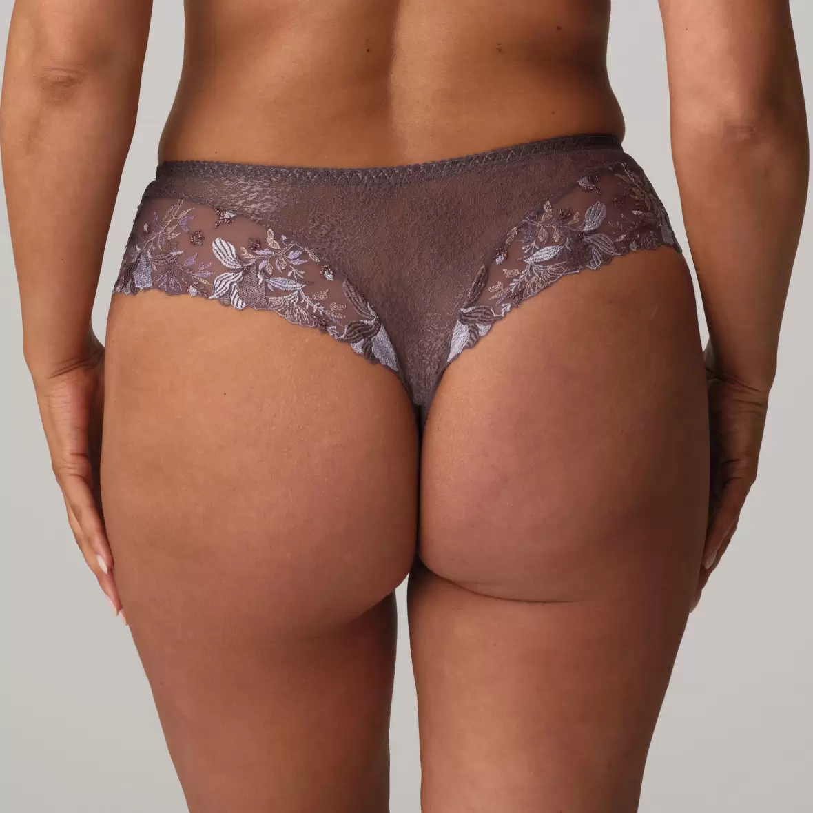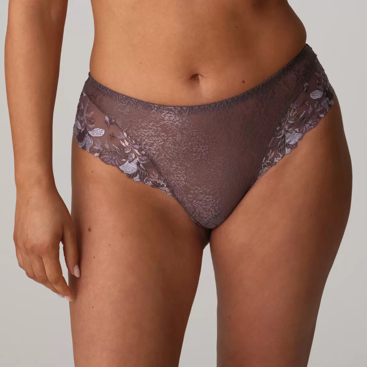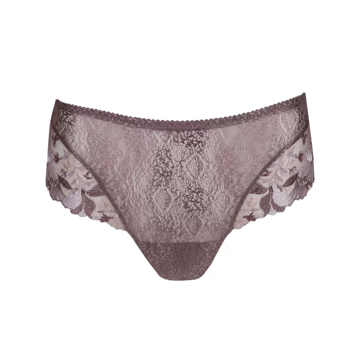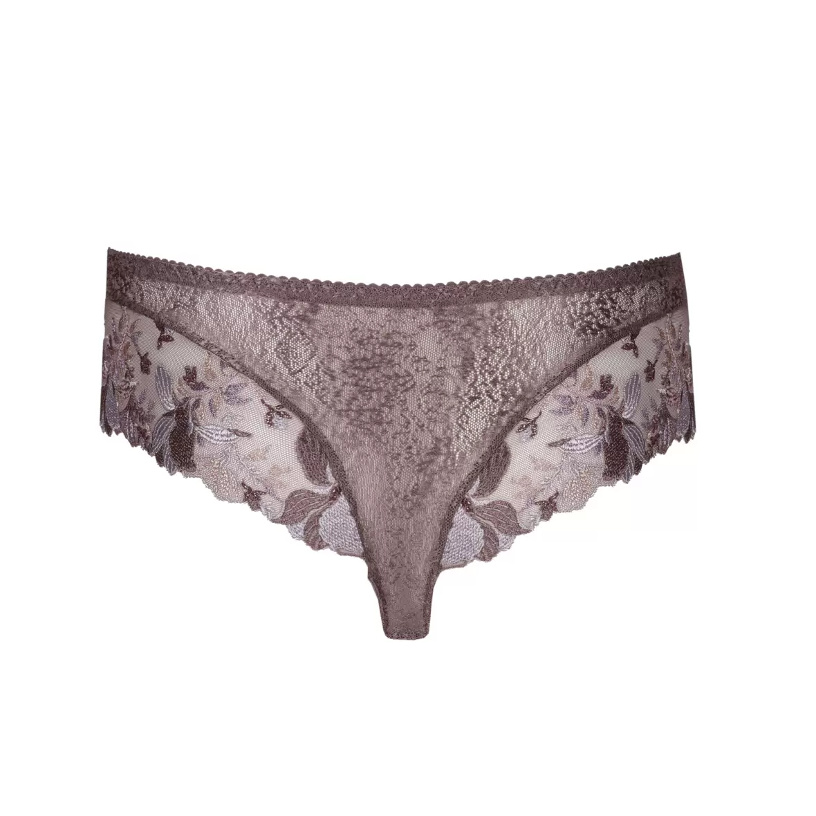 Denne string trusse er ekstra bred i livet og har i siderne et transparent stykke med en smuk brodering på, som fortsætter om bagpå. Resten er trussen er i en transparent blonde. I livet har trussen en elastikkant.Materiale: