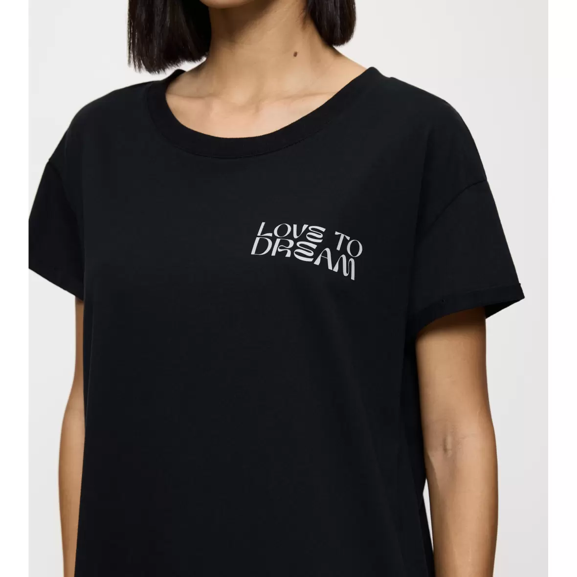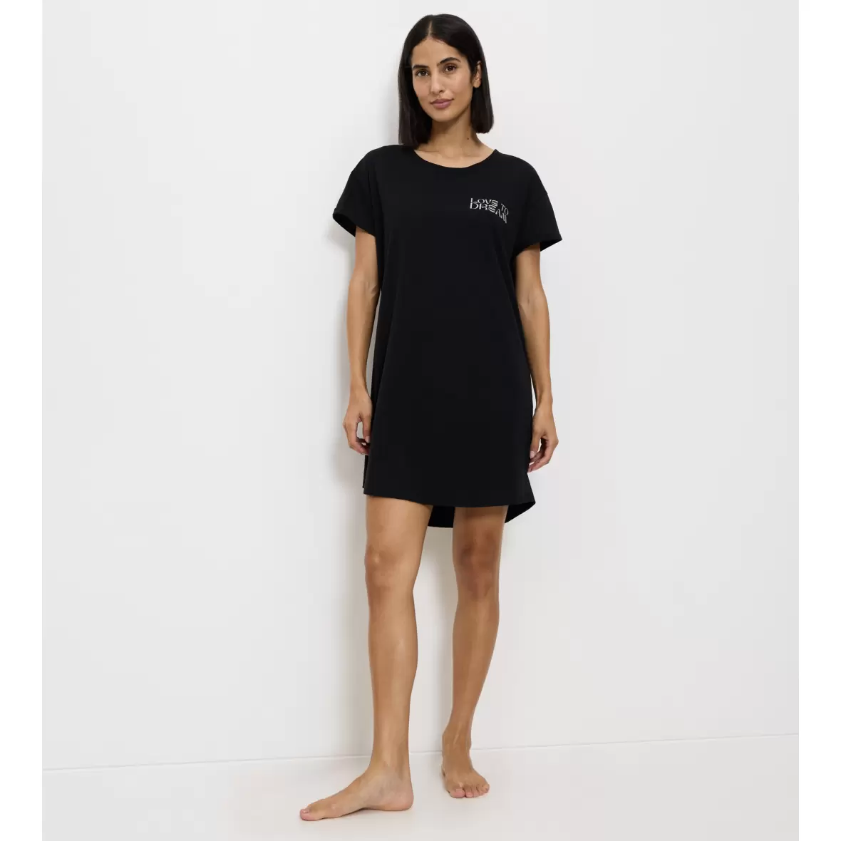 Klassisk natkjole fra Triumph med korte ærmer, og tekst på brystet.Natkjolen er sort, med en ribbet oval halsudskæring, og en rund kantafslutning.