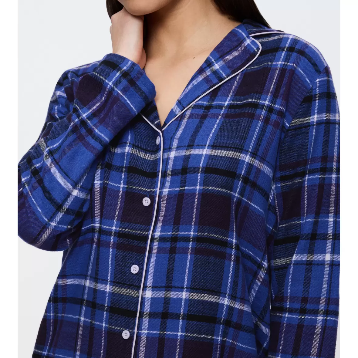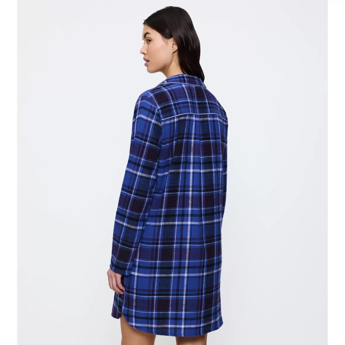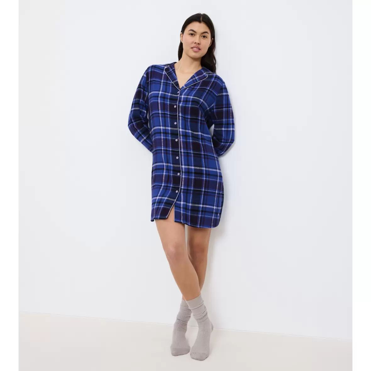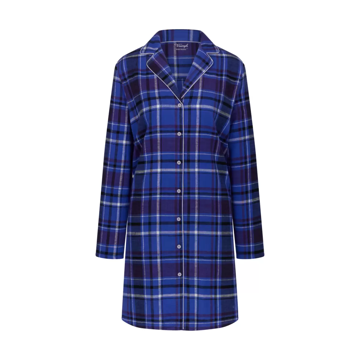 En blød og behagelig natkjole, i en skjorte model.Natkjolen er blå med lange ærmer, en krave og knappelukning foran.