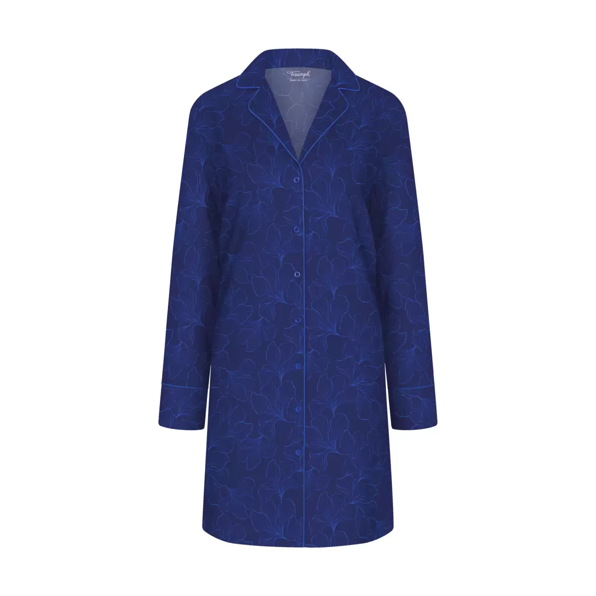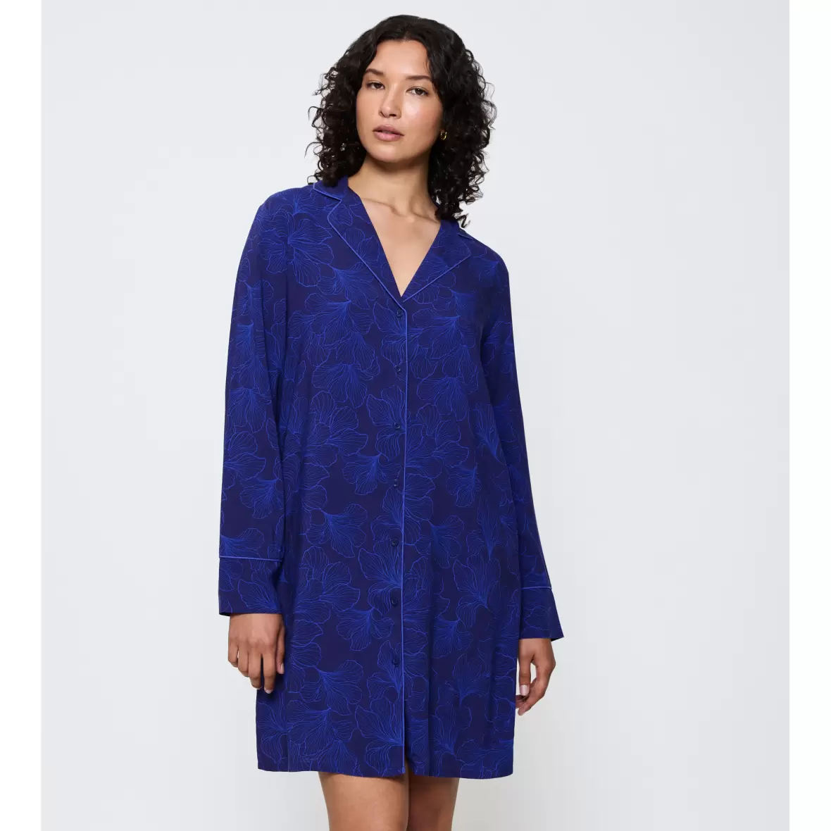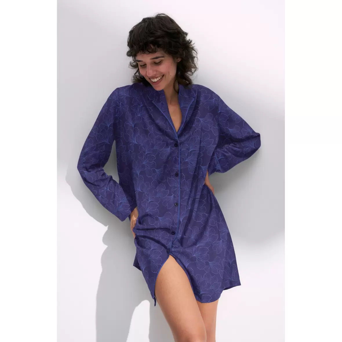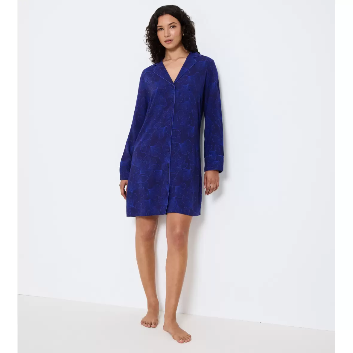 En blød og behagelig natkjole, i en skjorte model.Natkjolen har lange ærmer, en krave og knappelukning foran.