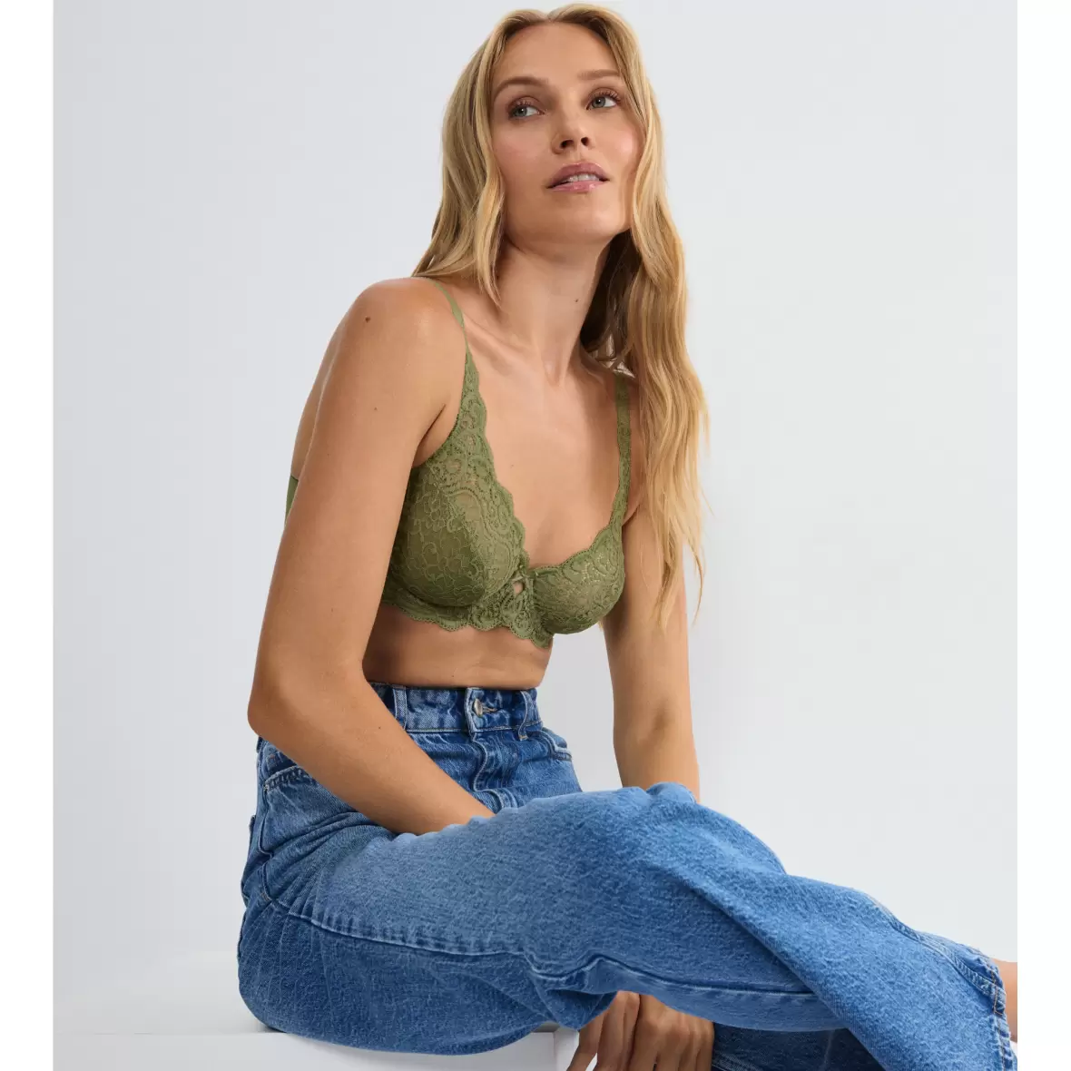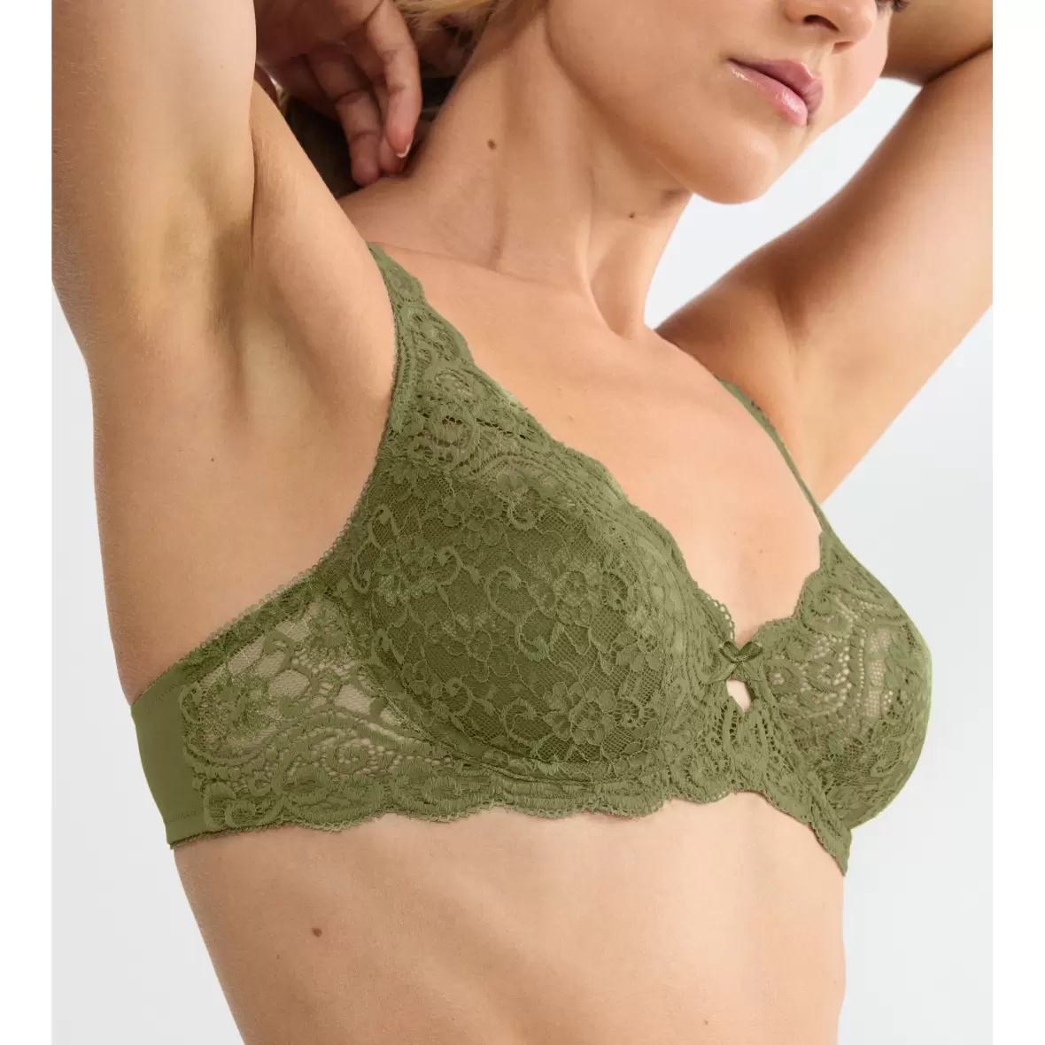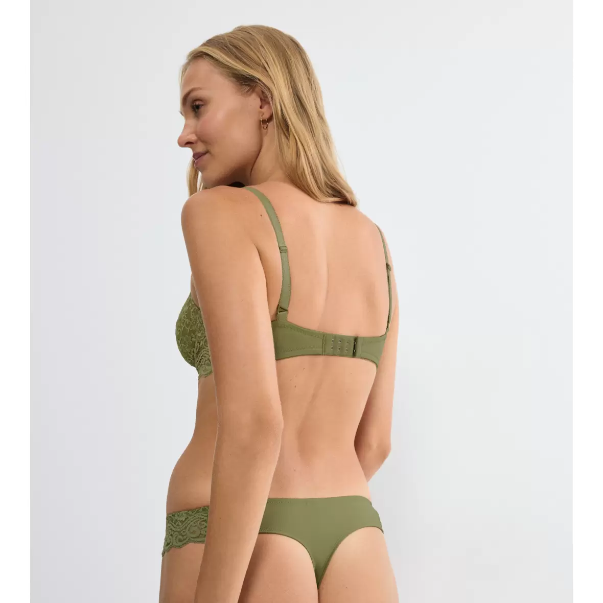 En bh med bøjle og uden vattering, i en grøn farve. Skålen er inddelt i to, den nederste del af skålen har to lag, for at give barmen en god support.Den øverste del af skålen er en blonde, som lægger sig til huden for at sikre en flot afslutning under tøjet.