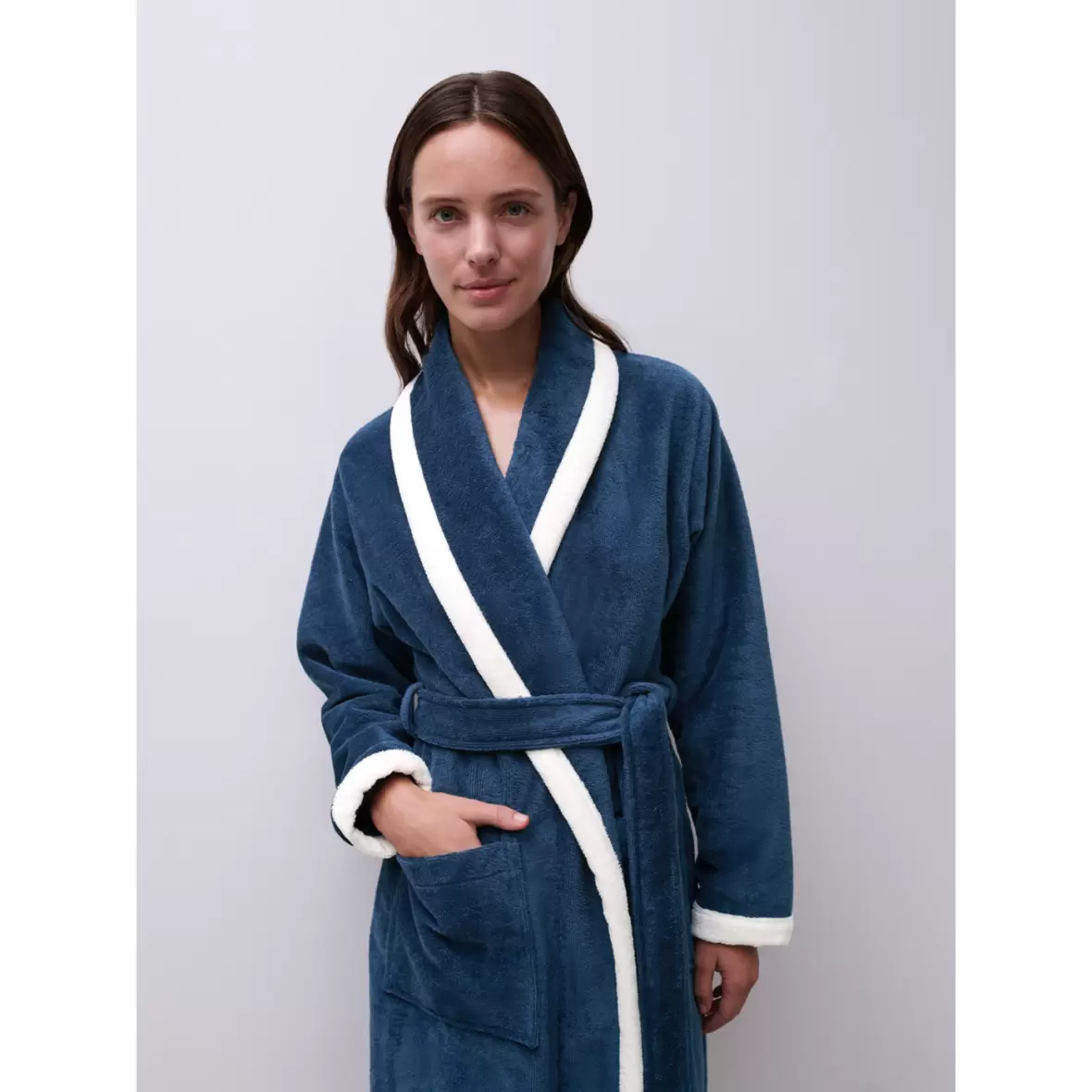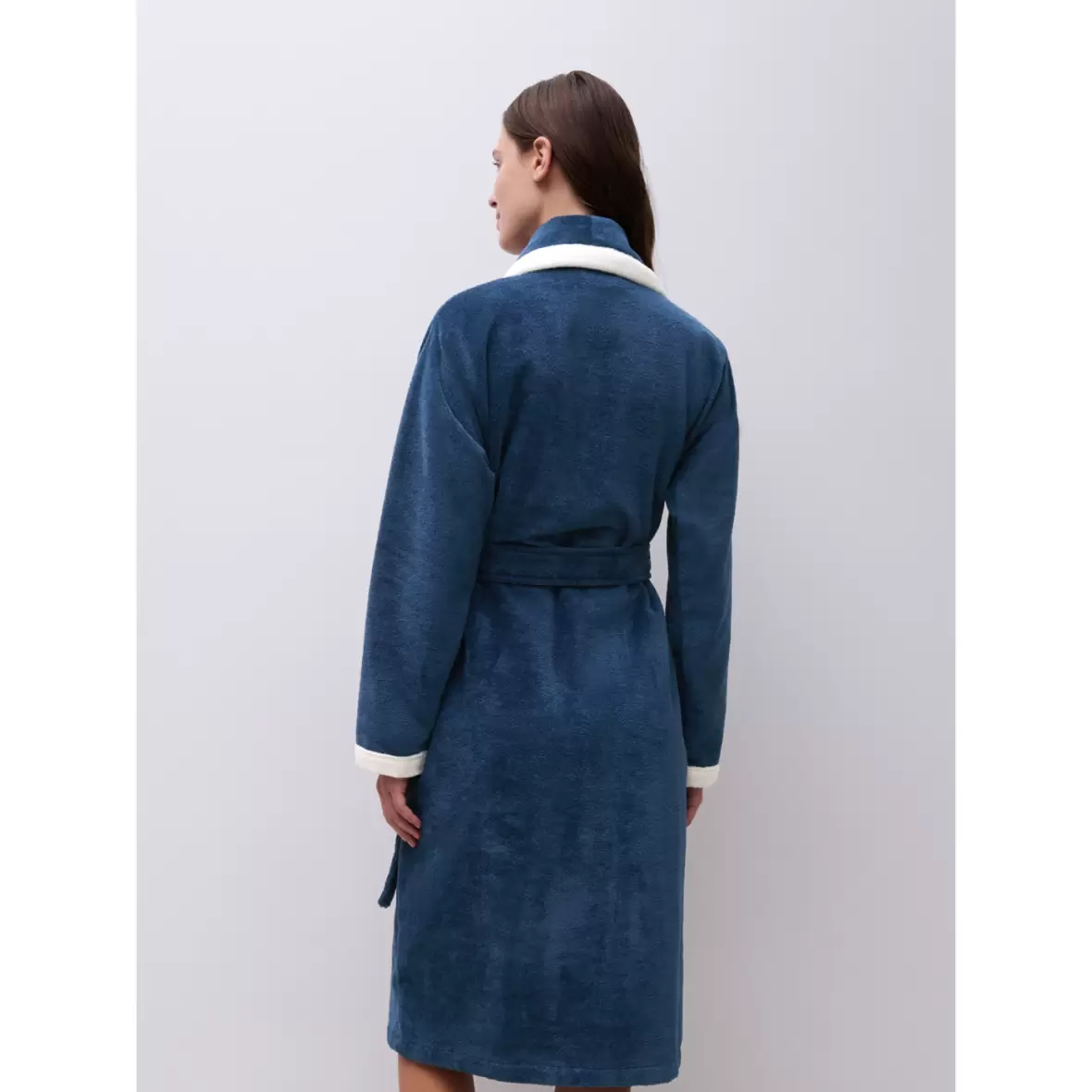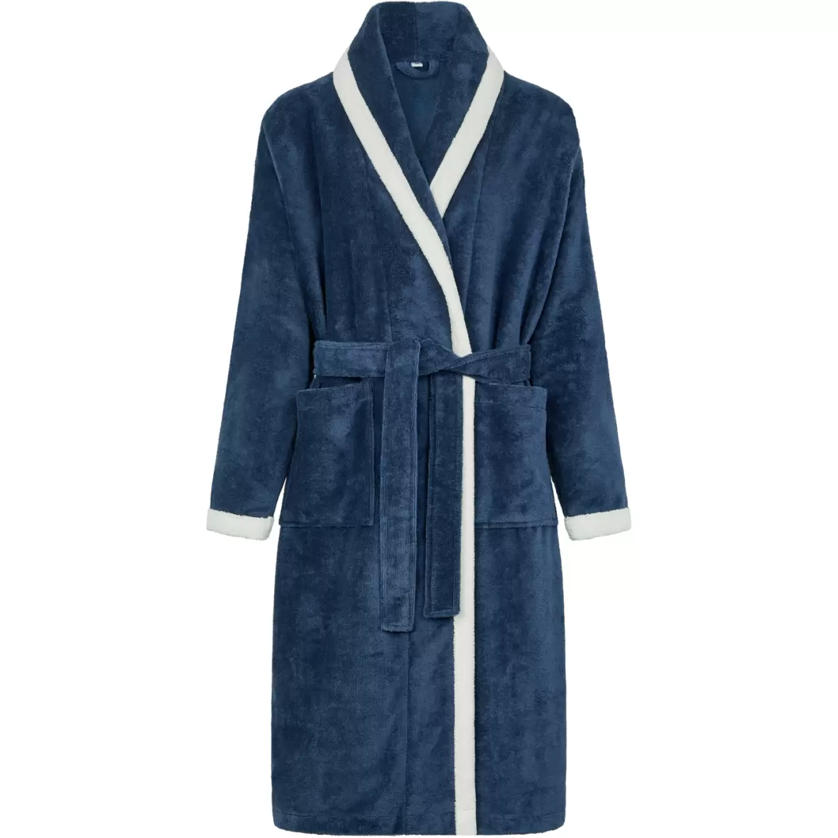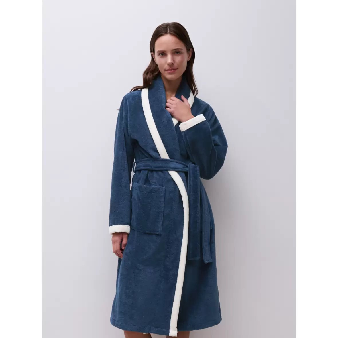 Denne behagelige kåbe fra Femilet, er afsluttet med en elegant "hvid piping" langs ærmerne, flappen og lommerne.Kåben har et bælte i taljen.