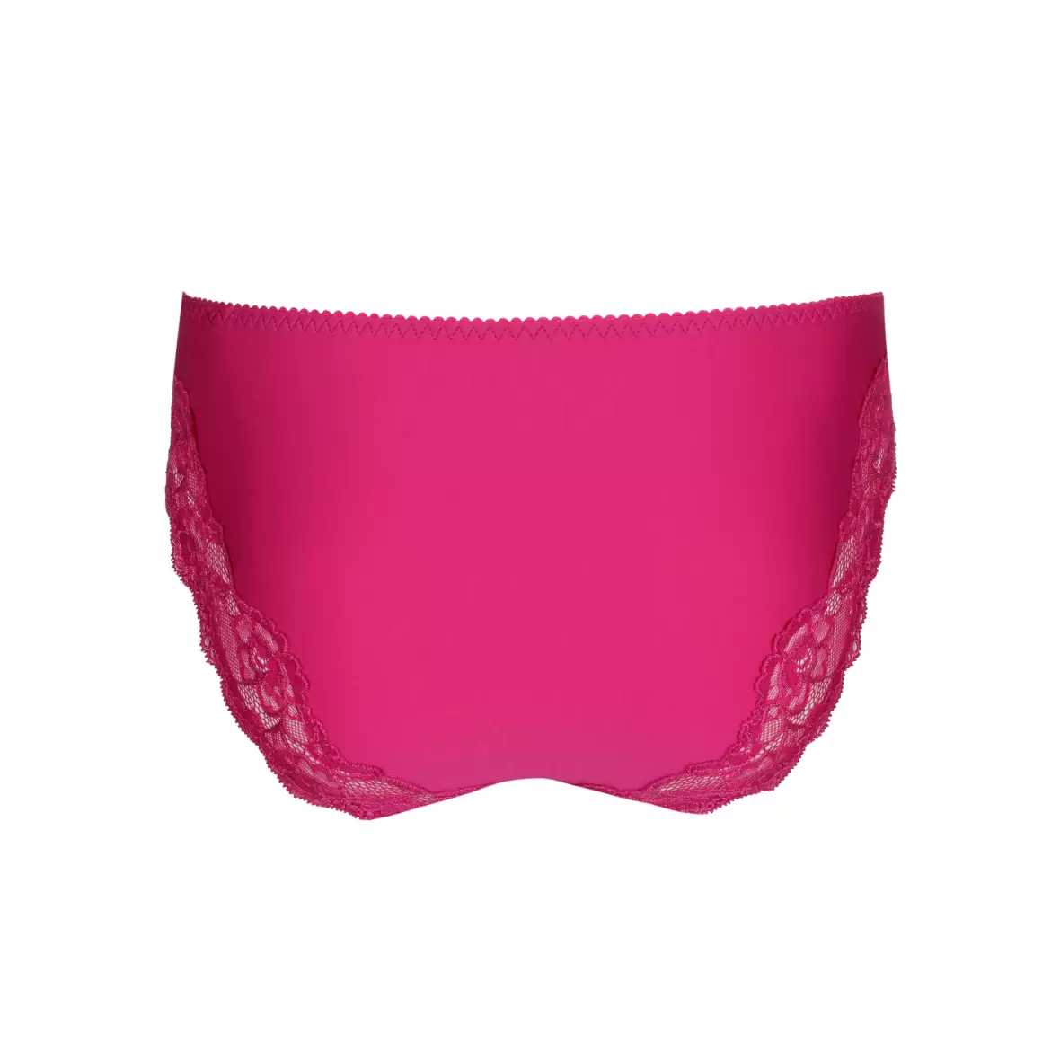 Denne trusse i en pink farve, har en transparent blonde i begge sider, resten af trussen er et uigennemsigtigt og ternet stof. Trussens kanter i livet og benudskæringen er elastisk. Trussen har en høj benskæring og en lav livvidde.Materiale: