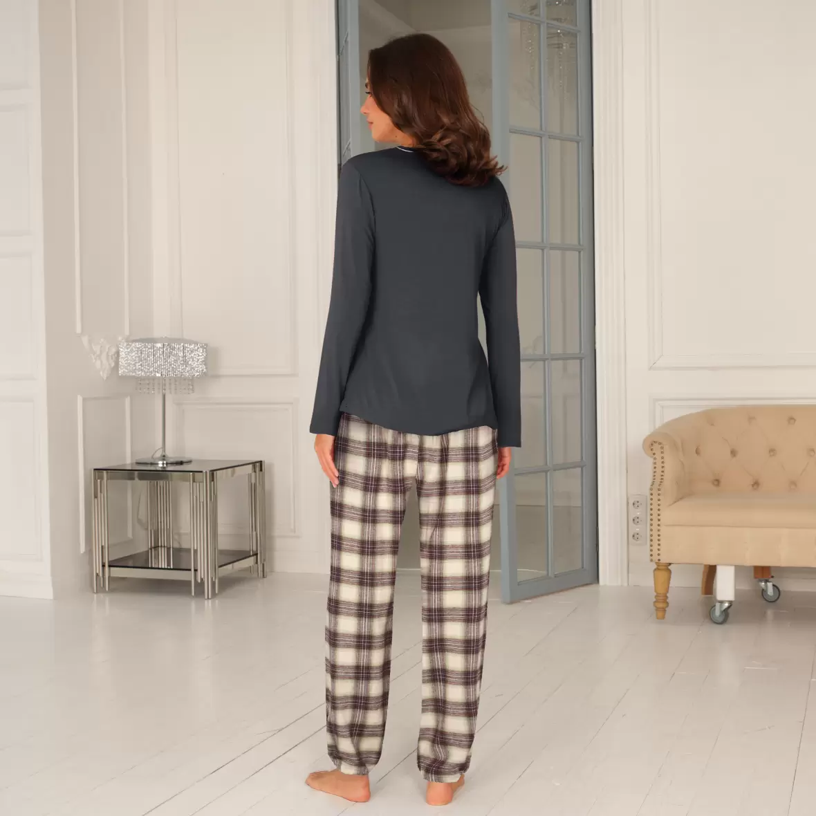 Opdag vores Cotton Flannel Pyjamas i en stilfuld charcoal farve fra Lady Avenue. Denne behagelige pyjamas er fremstillet i en lækker bomuldskvalitet, der sikrer maksimal komfort, når du slapper af derhjemme eller nyder en god nats søvn. Blusen er ensfarvet med lange ærmer og en rund halsudskæring, hvilket giver et moderne og tidløst look.Bukserne har et klassisk ternet mønster og er designet med elastik i livvidden for optimal pasform og bevægelsesfrihed.